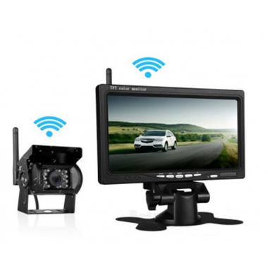 Conjunto de câmara de vigilância preta com monitor TFT color e ícones de Wi-Fi