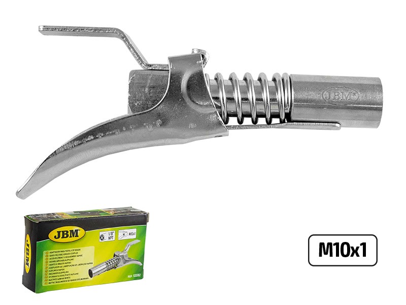 Engate para lubrificação, serviço pesado e fácil de liberar. Design ergonômico Fácil de manusear: faz com que o acoplamento e o desacoplamento sejam realizados sem esforço e economizando tempo de trabalho. Recomenda-se usá-lo com as pistolas de graxa JBM ref. 50751 e 50852, embora seja adequado para uso na maioria das pistolas. A válvula de retenção integrada permite que a unidade seja facilmente desconectada a pressões de até 15.000 PSI (1.034 bar). Conexão NPT de 1/8 "integrada. 3 mandíbulas endurecidas resistentes a altas pressões sem deformação.