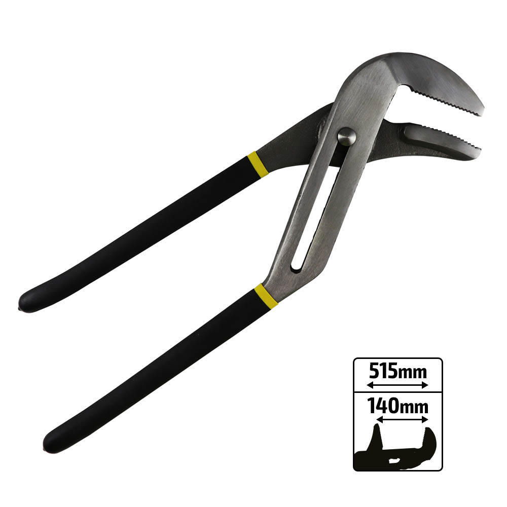 Alicate de pressão com cabo preto e detalhes amarelos, medidas indicadas ao lado