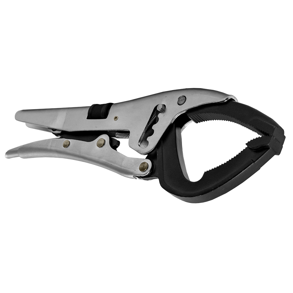 Alicate de bloqueio metálico e preto em fundo branco
