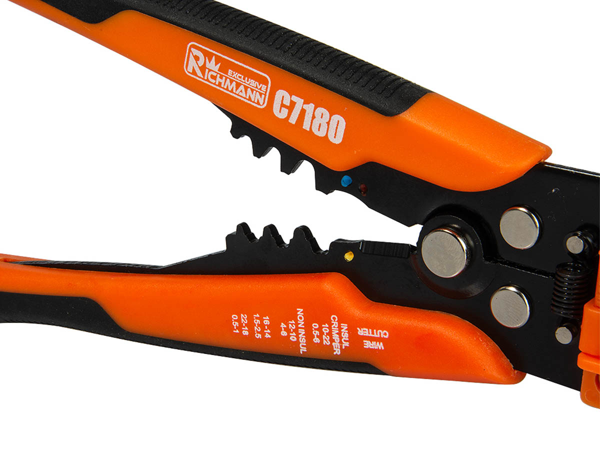 Alicate automático para descarnar cabos com comprimento total de 205 mm. A lâmina é feita de aço ferramenta SK5 / Cr12MoV HRC52-60 de alto carbono, caracterizado por maior resistência, resistência a rachaduras, lascas ou embotamento. Para decapagem e crimpagem de terminais de conectores 24-10 AWG. Faixa de condutores processados de 0,2 a 6,0 mm2. O extrator está equipado com um botão de microajuste e um limitador. Cabo de plástico feito de PP e TPR, PASH. Equipado com alicate de corte de cabos. A alça é coberta com um revestimento antiderrapante especial. Qualidade profissional.