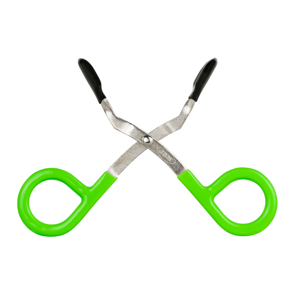Tesoura de sobrancelhas verde com cabos plásticos e lâminas de aço inoxidável em embalagem blister