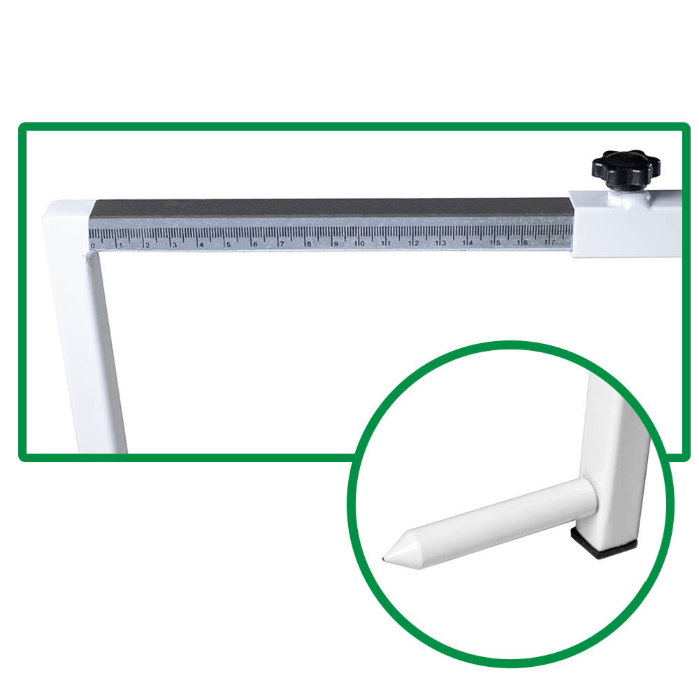 Régua metálica com escala métrica em estrutura branca e botão de aperto preto