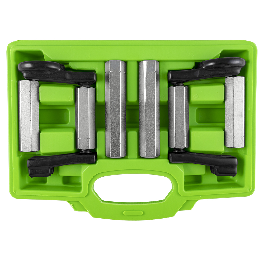 Conjunto de ferramentas metálicas com punhos pretos numa caixa verde