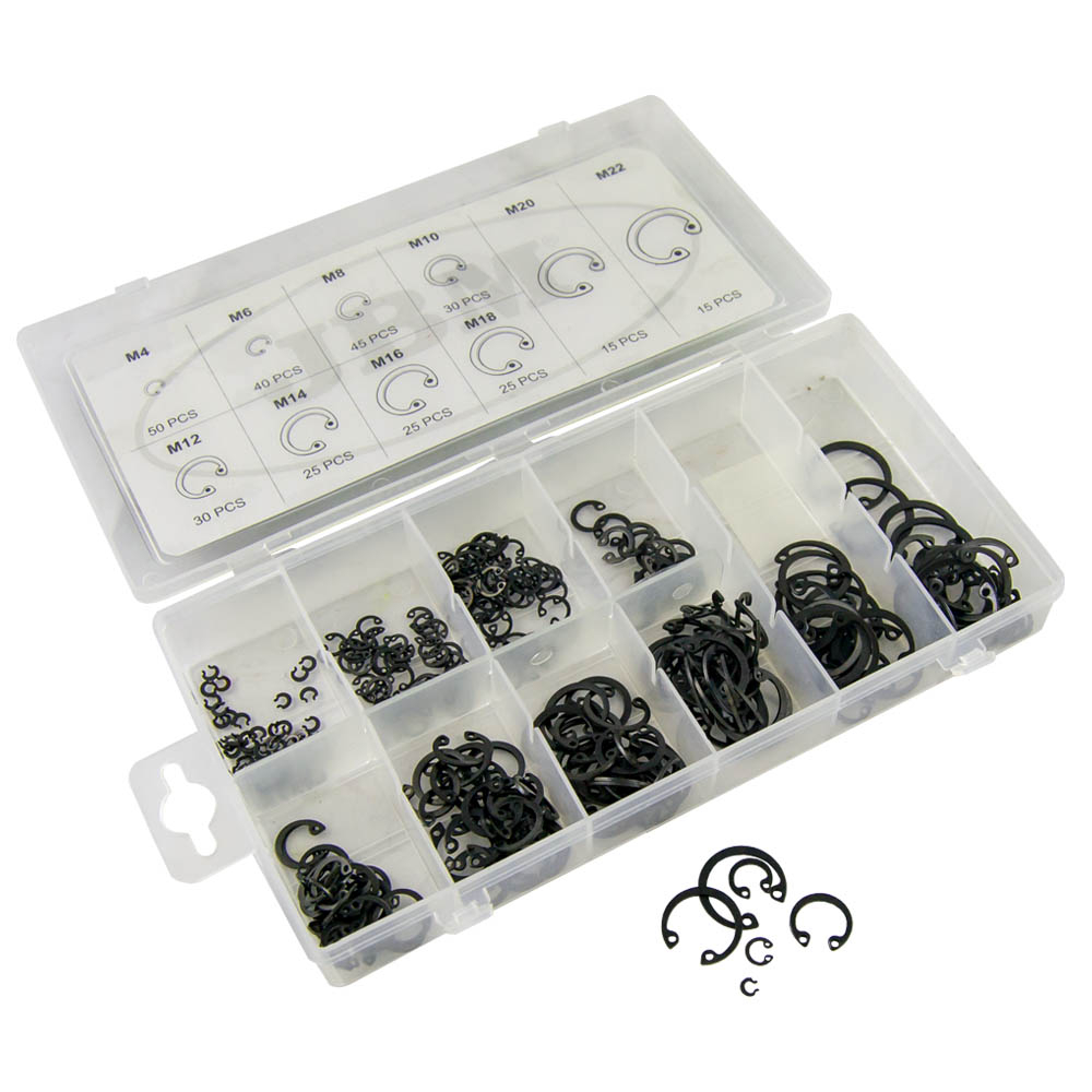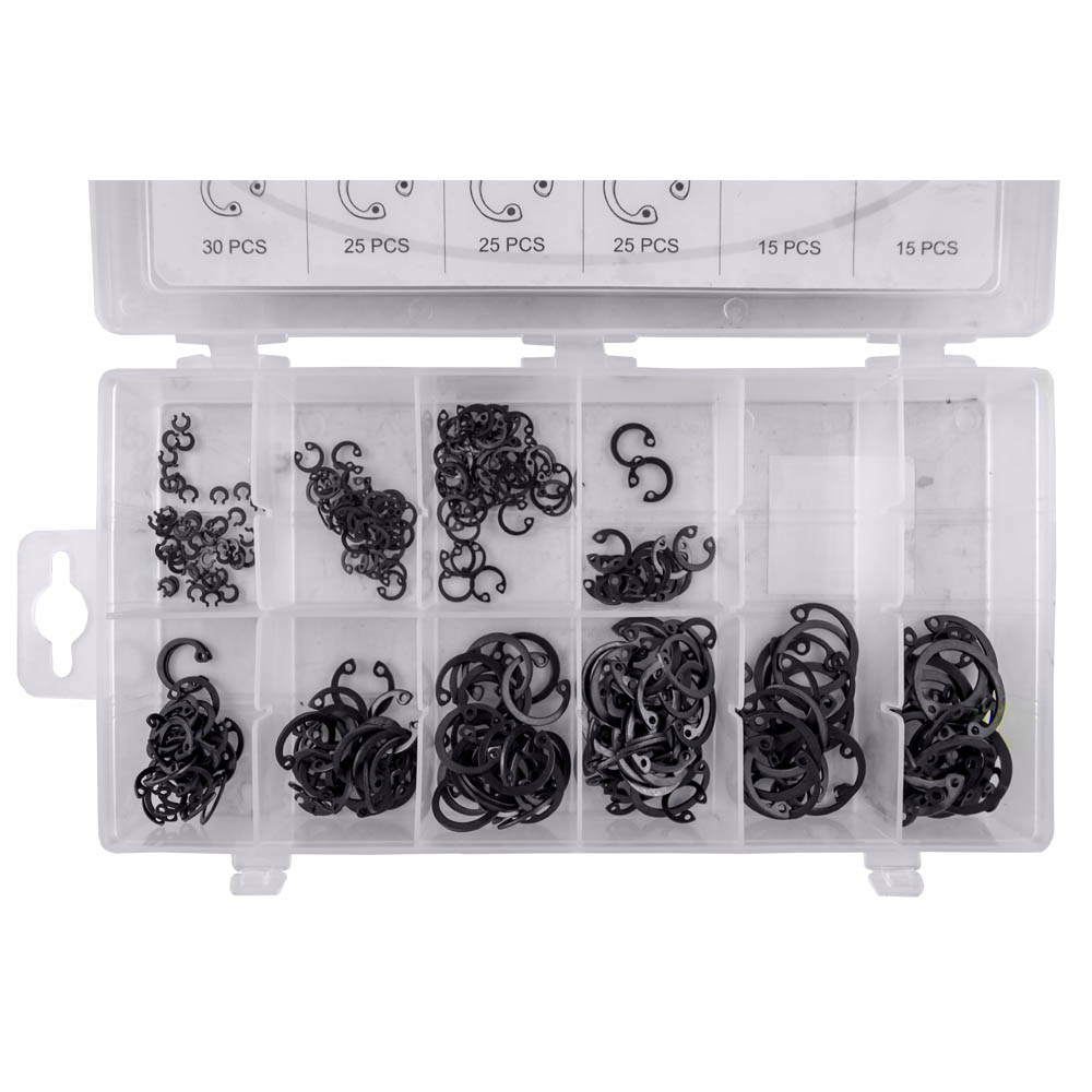 Conjunto de anilhas de retenção pretas em caixa transparente com divisórias e etiquetas de tamanhos