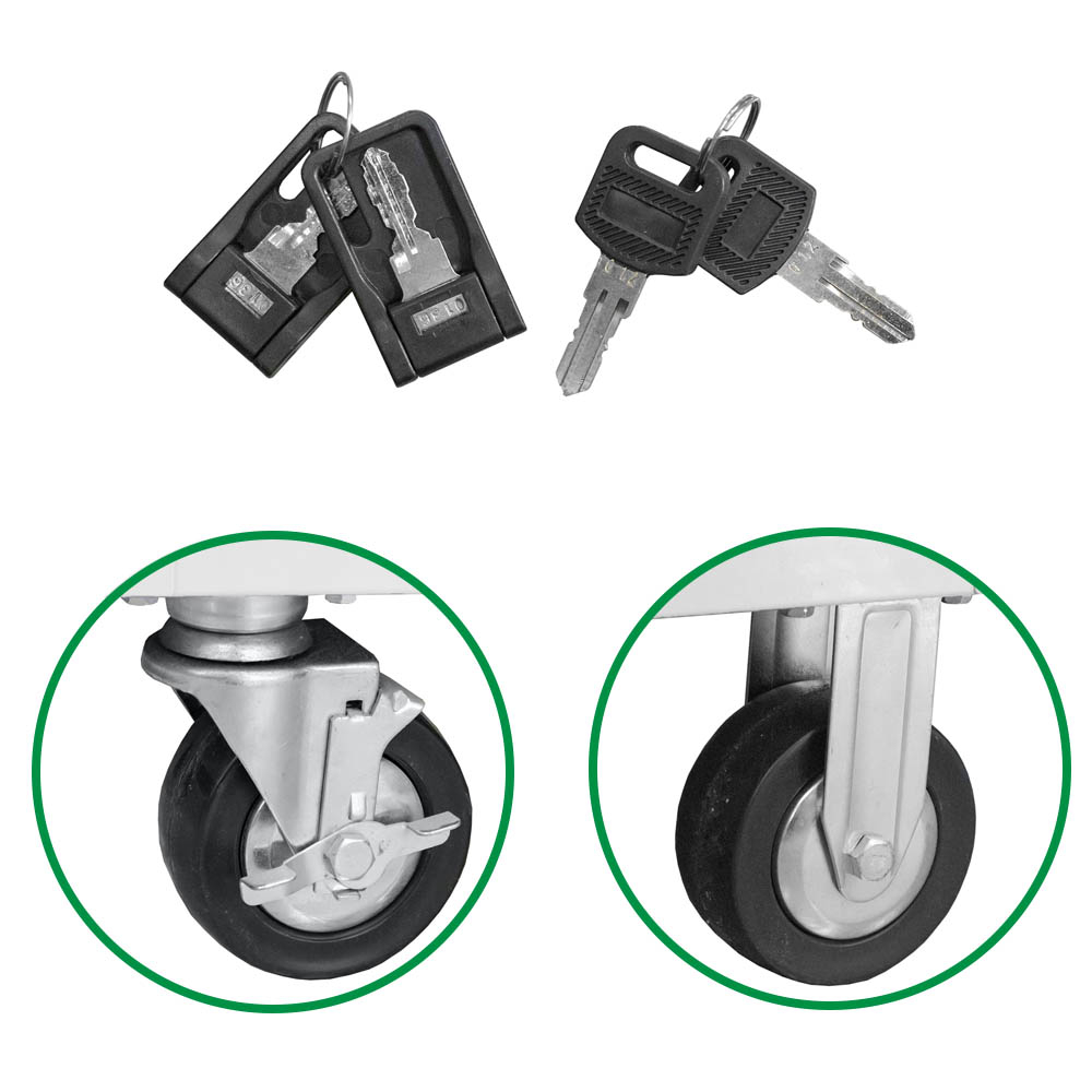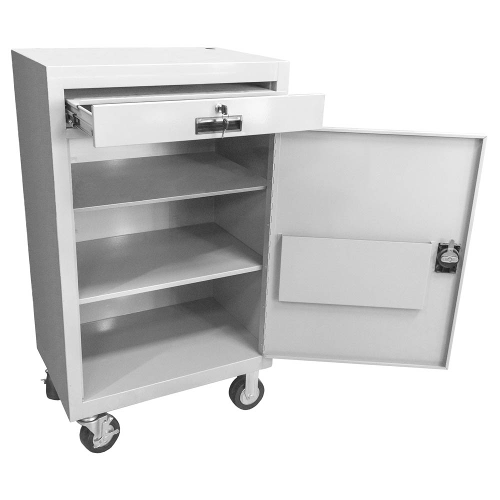 Armário metálico branco com gaveta e prateleiras internas, portas abertas, sobre rodas