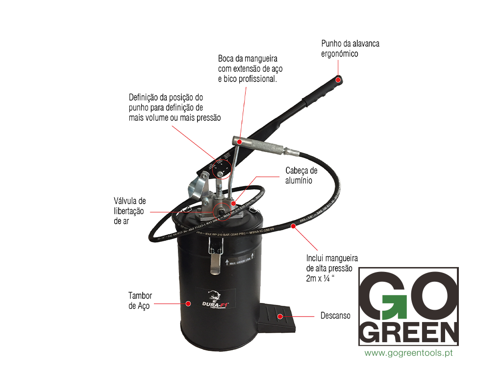 Recipiente de aço com alavanca e mangueira, rótulos das partes e logótipo GO GREEN