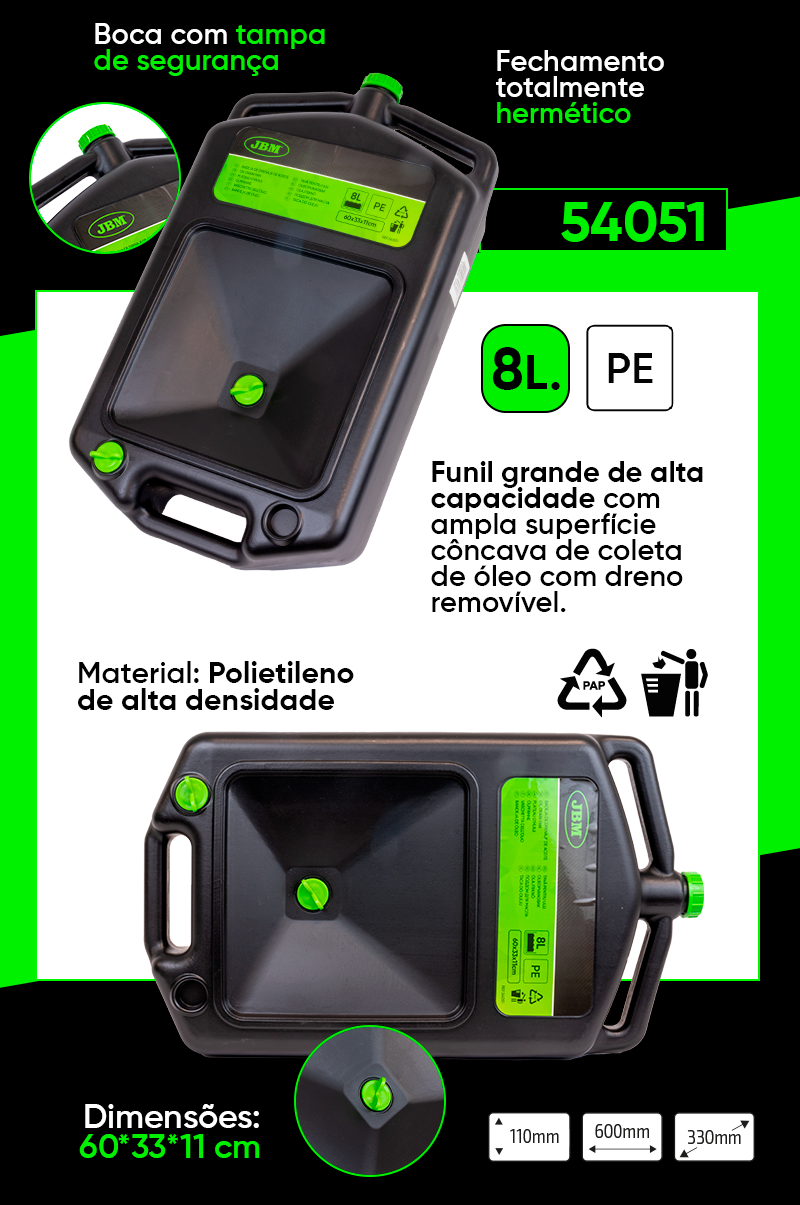 A bandeja de drenagem de óleo tem um grande funil e alças de grandes dimensões para fácil portabilidade.