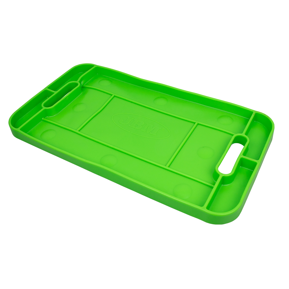 Material antiderrapante. Ideal para qualquer ambiente de trabalho, fornecendo acesso fácil e conveniente às ferramentas. Alça interna portátil e conveniente. Resistente ao óleo. Resistente a temperaturas de até 140 ºC. Régua embutida de ambos os lados da bandeja. Compartimentos separados para organização adequada das ferramentas. Design exclusivo do copo de sucção para fixação segura em superfícies planas.