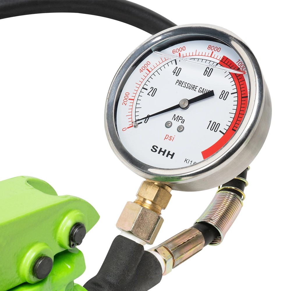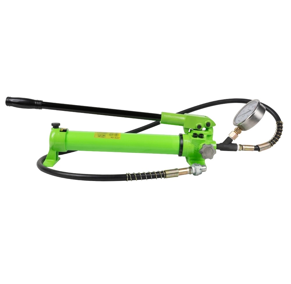 Bomba hidráulica manual verde com manómetro e mangueira preta.
