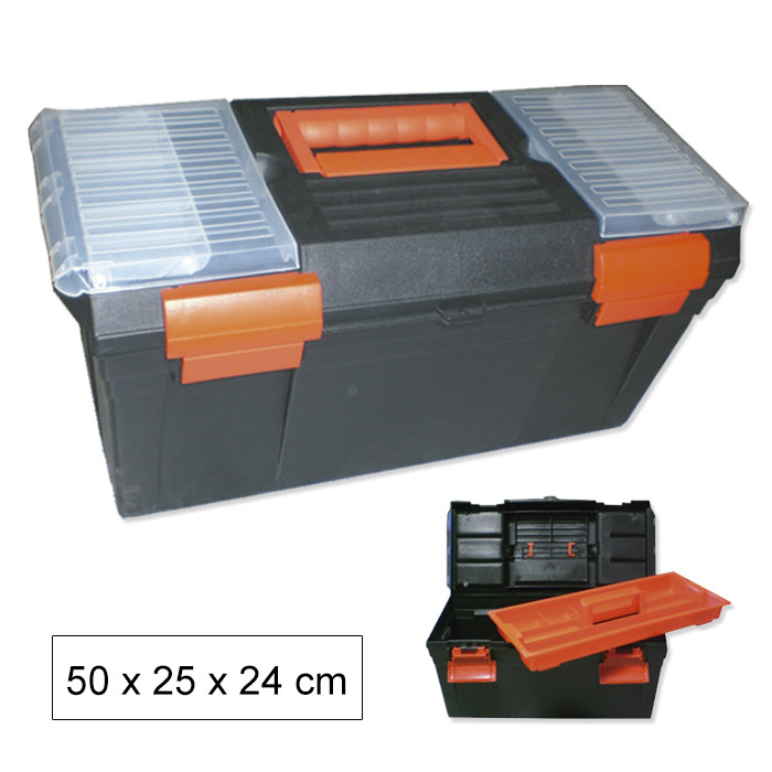Caixa de ferramentas preta com fechos laranja e tampas transparentes para pequenos compartimentos no topo.