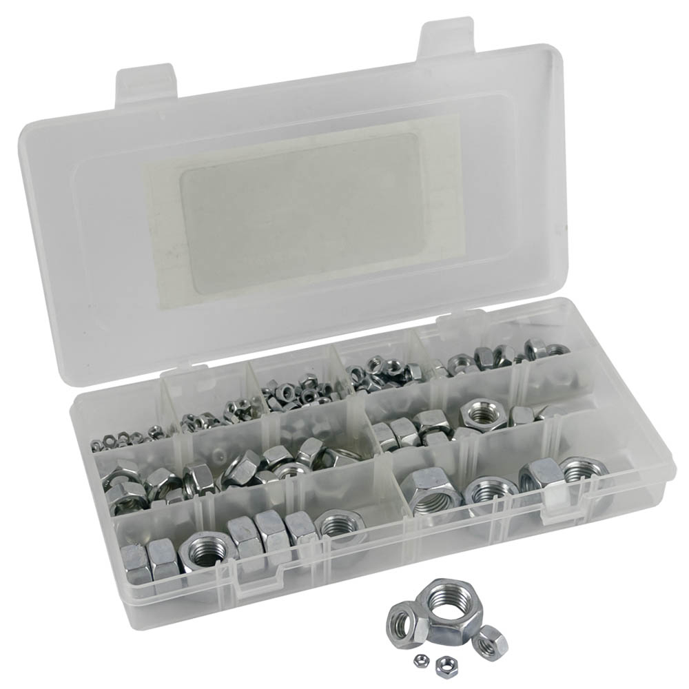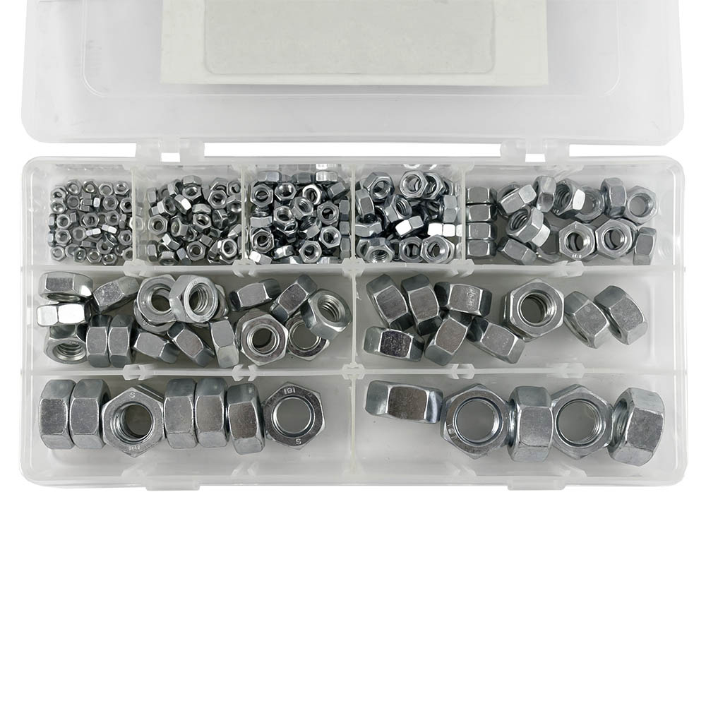 Conjunto de porcas metálicas em caixa plástica