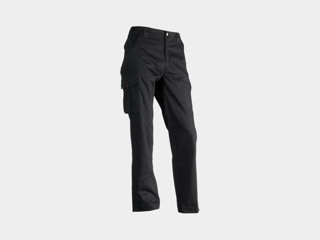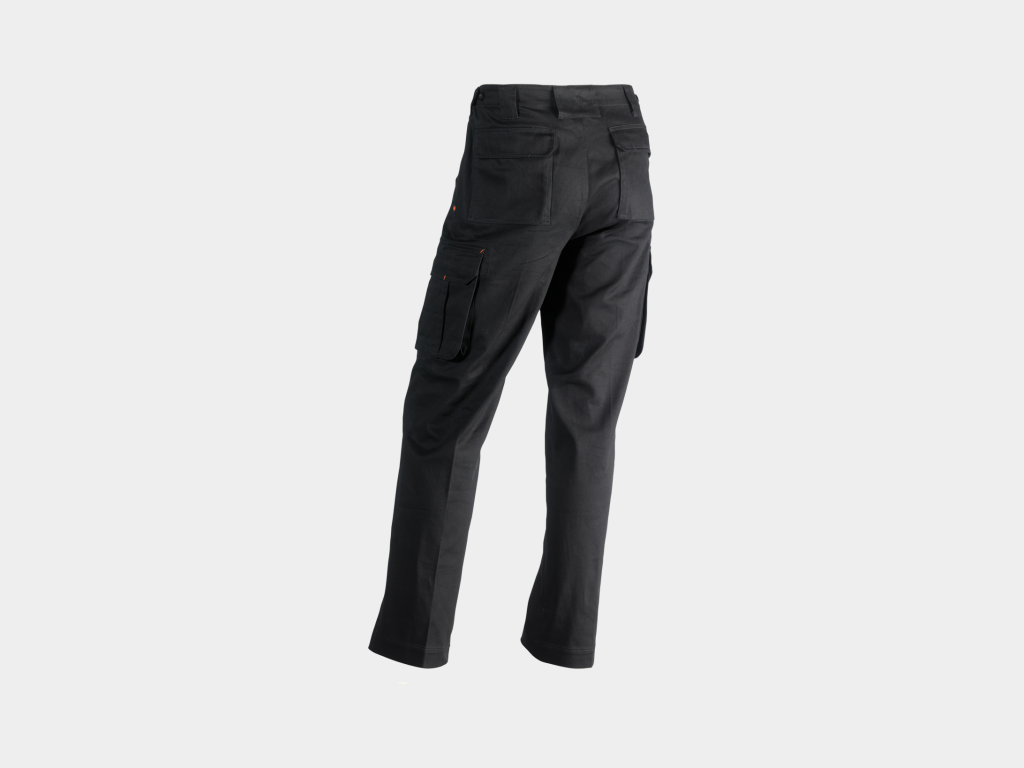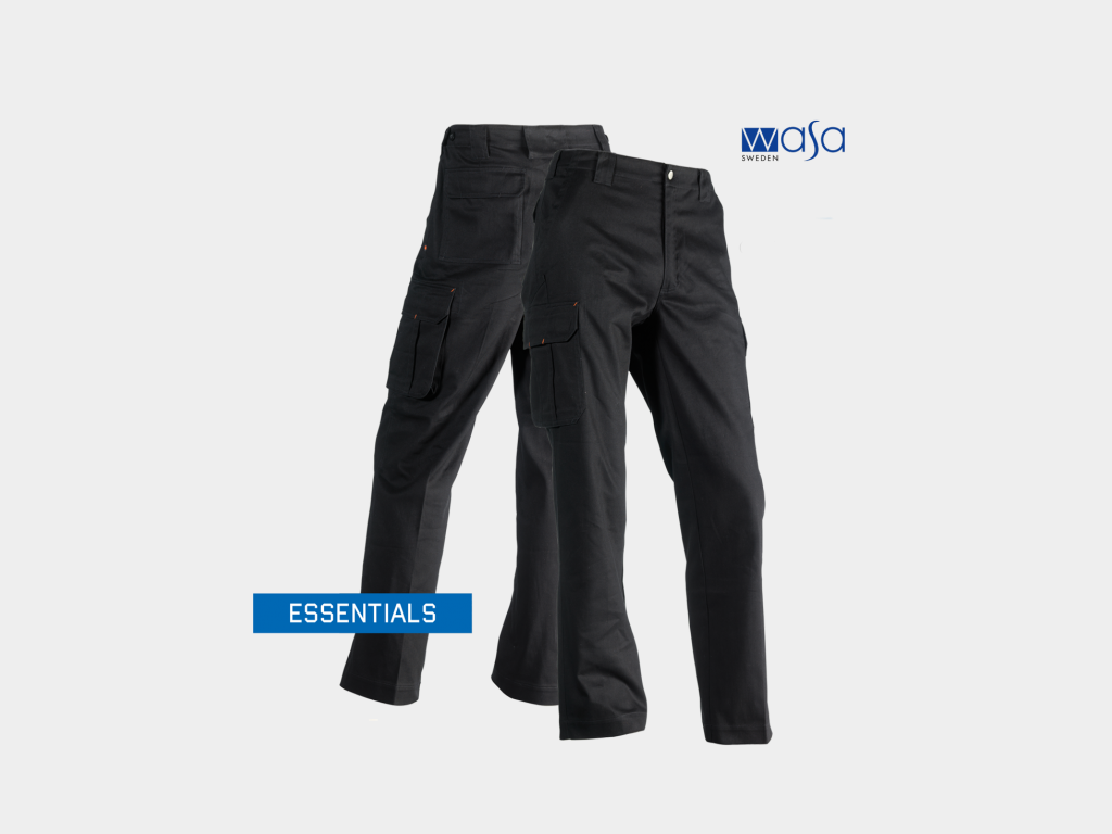 Duas calças pretas com bolsos e texto ESSENTIALS