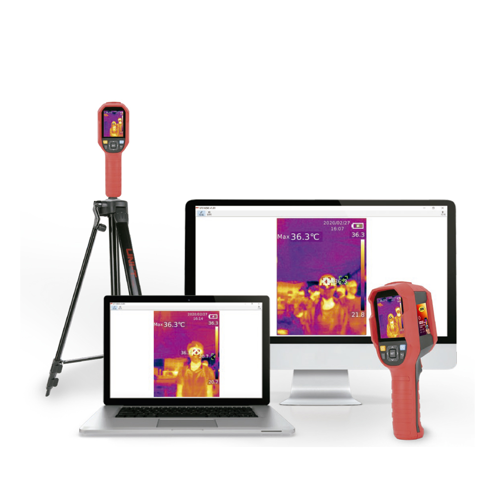 Câmara térmica vermelha e preta JBM com ecrã LCD mostrando imagem térmica de um pato