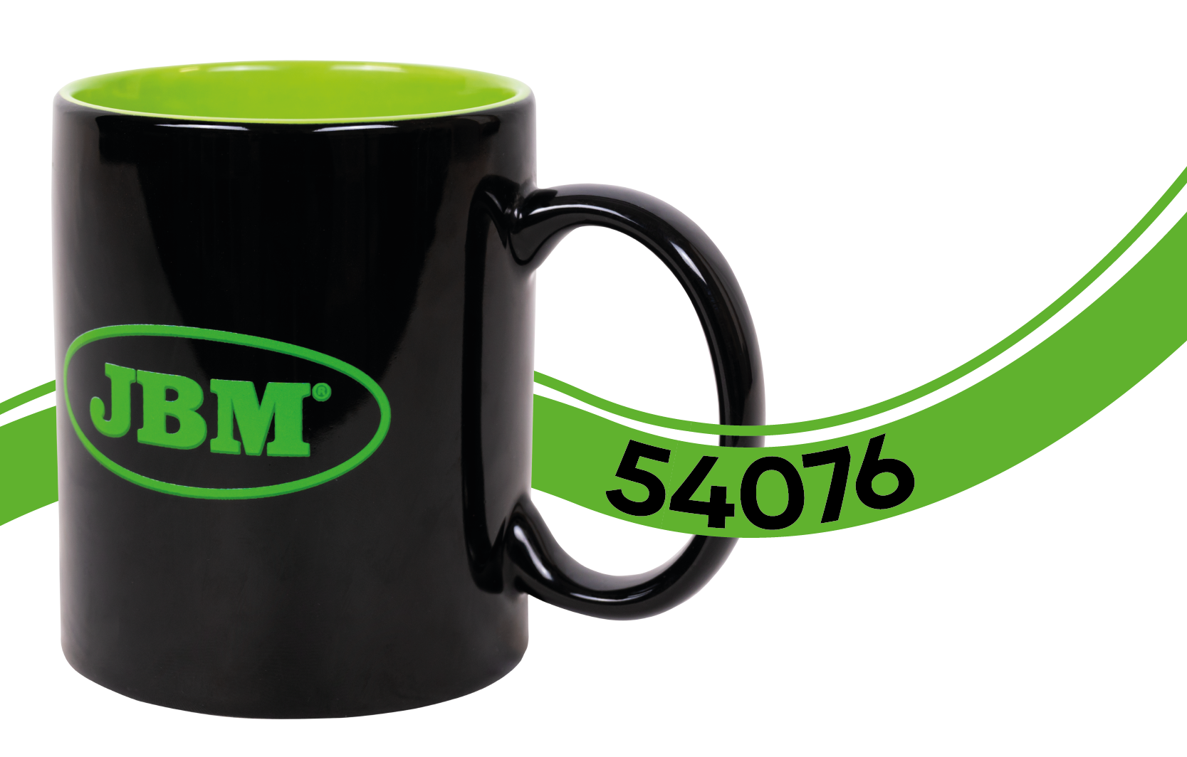 Caneca preta com interior verde, logótipo JBM verde, número 54076 em verde