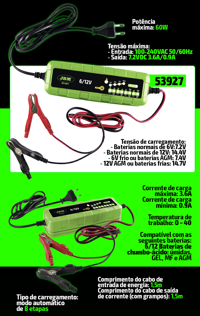 Corrente de carga máxima: 3,6 A Corrente de carga mínima: 0,9 A Temperatura de trabalho : 0 ~ 40 ℃ Compatível com as seguintes baterias: Baterias de chumbo 6/12 : Molhadas, GEL, MF e AGM Tipo de carregamento: modo automático de 8 etapas Comprimento do cabo de