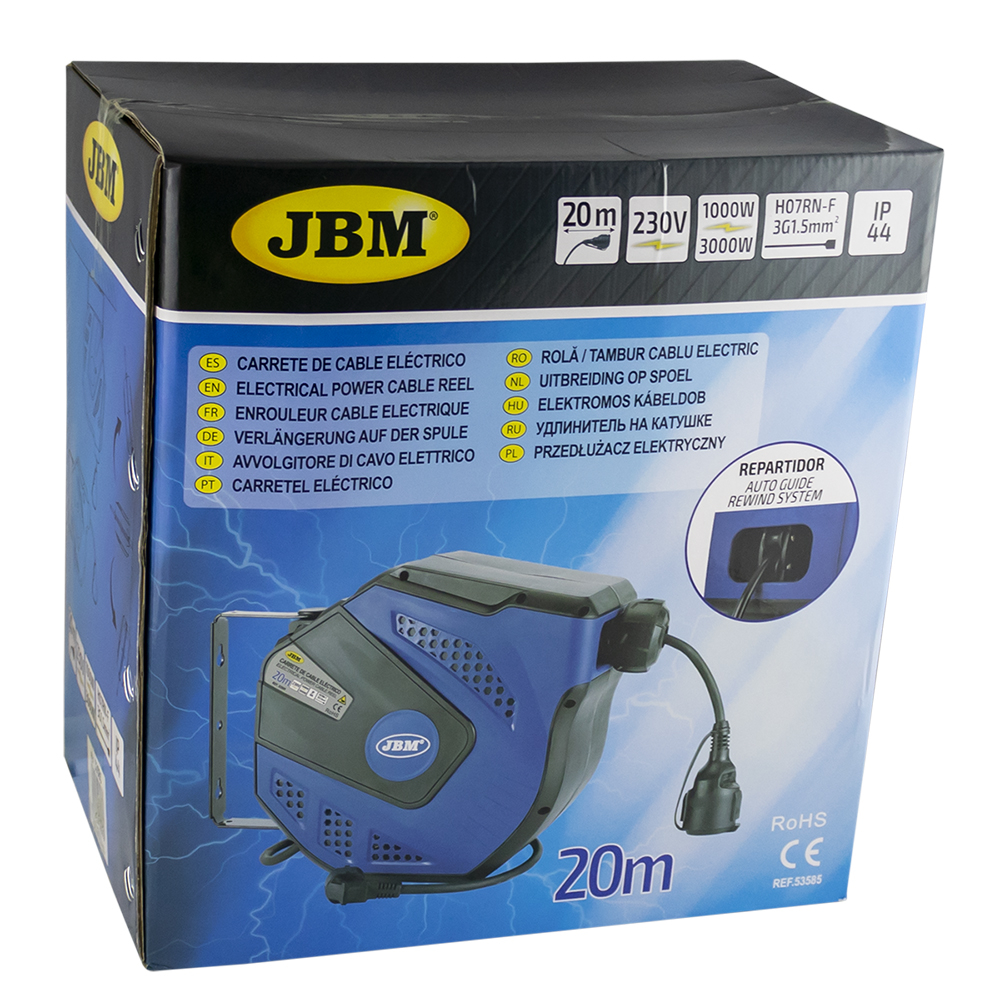Bobina de cabo elétrico azul e preto JBM com suporte de parede e ficha, em caixa azul com informações técnicas
