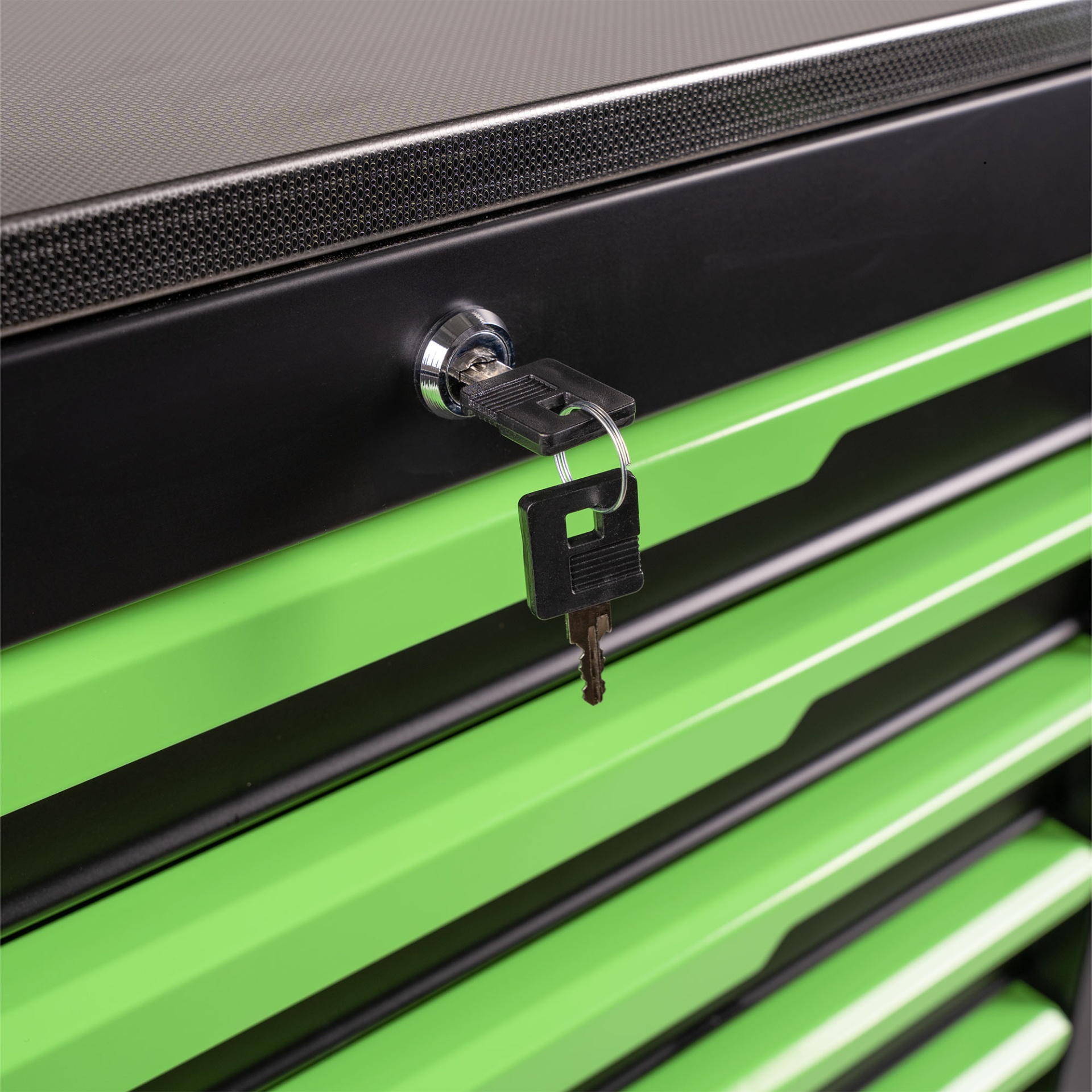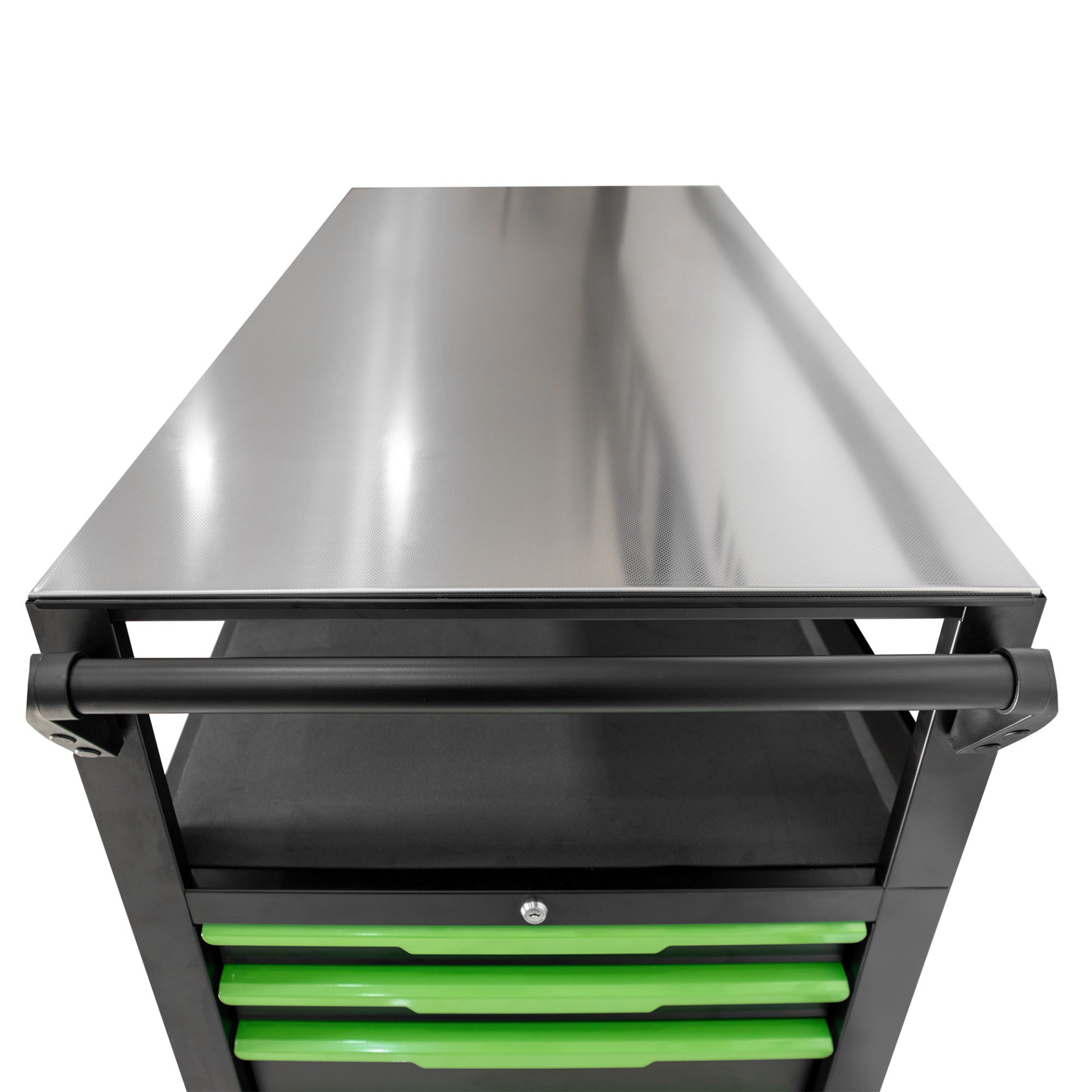 1. 1,0 mm de aço para a estrutura e 0,8 mm para as gavetas 2. Acabamento em pó de grão preto 3. Corrediças de rolamentos de esferas de 45 mm de largura para trabalhos pesados com retorno automático. 4. Tampo de trabalho em aço inoxidável de 18 mm e tapetes de gaveta de 2,5 mm 5. Puxadores de gaveta metálicos com placas de identificação 6. Painéis perfurados com orifícios quadrados 7. Duas prateleiras fixas na parte traseira 8. 5x2 pol. Rodas TPR, 2 giratórias bloqueáveis e 2 rígidas 9. Embalamento: Caixa de cartão castanha de 5 camadas + saco PE + madeira