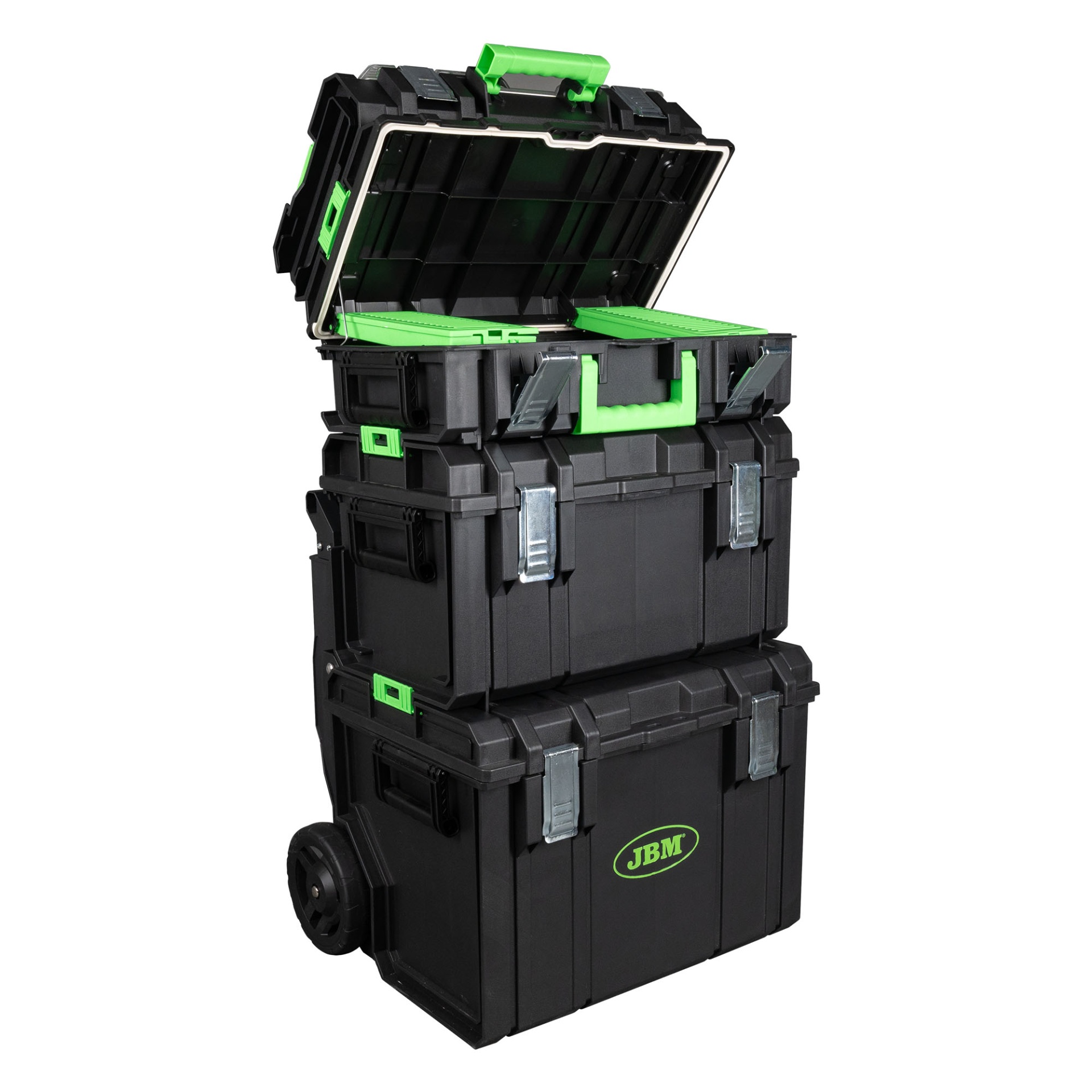 Sistema de armazenamento concebido para organizar e transportar ferramentas, peças e outros objetos. Possui rodas giratórias com quatro caixas empilháveis que podem ser organizadas de acordo com as necessidades de cada utilizador.