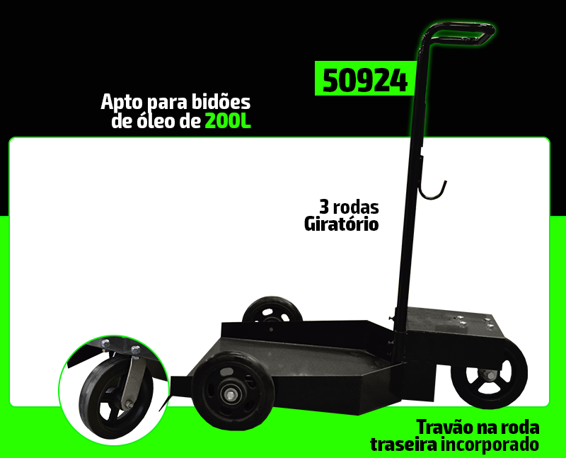 Carrinho preto metálico para bidões de óleo com três rodas e travão incorporado na roda traseira