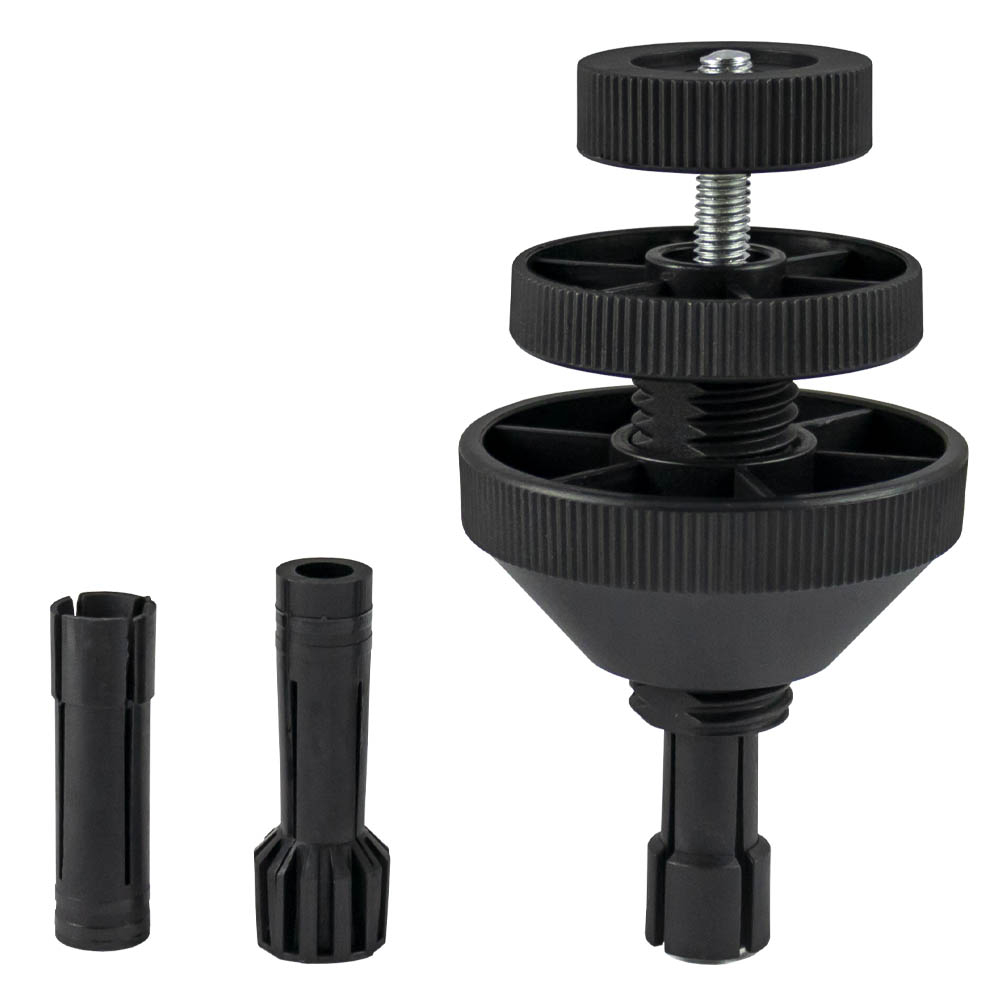 ferramenta preta desmontada com peças plásticas e rosca metálica