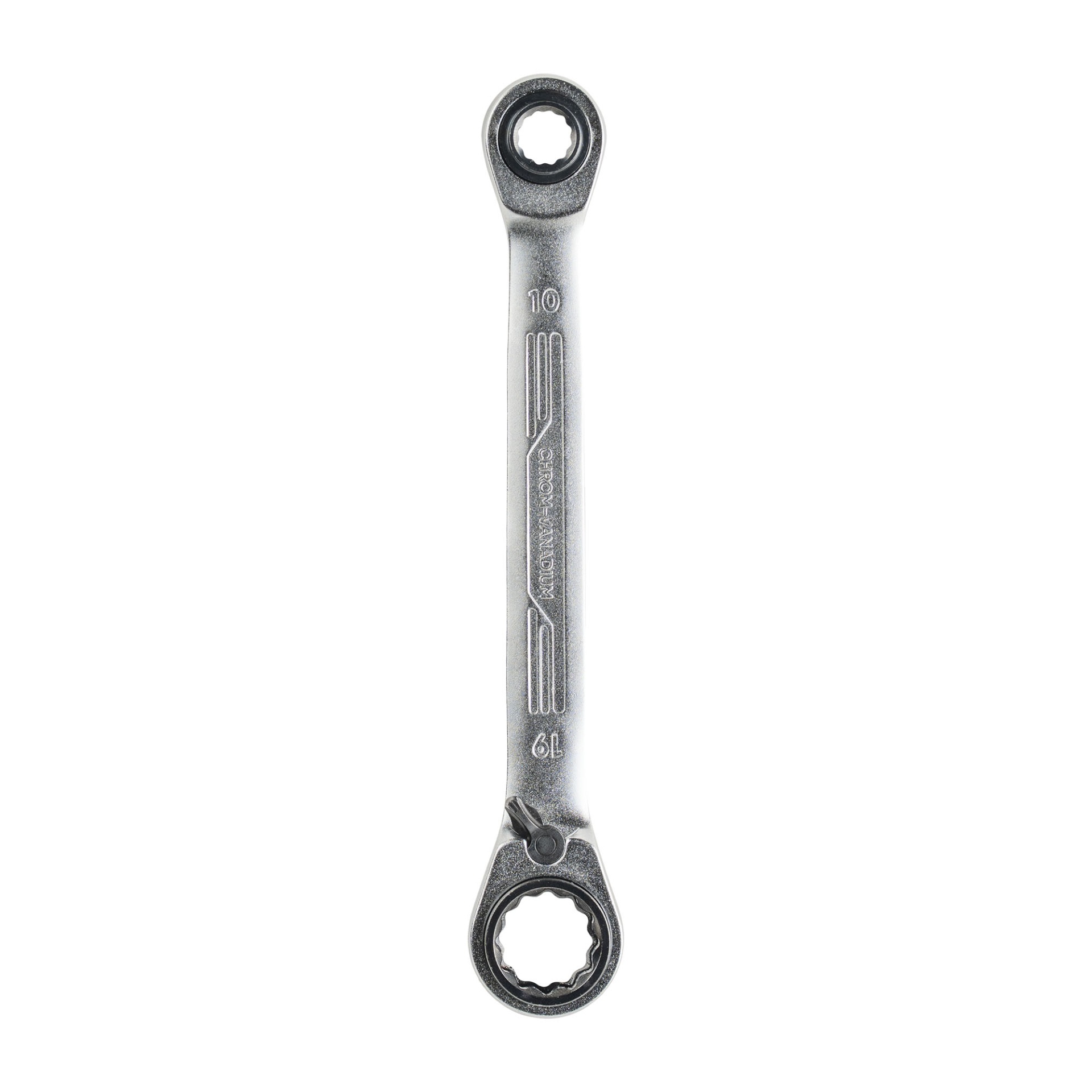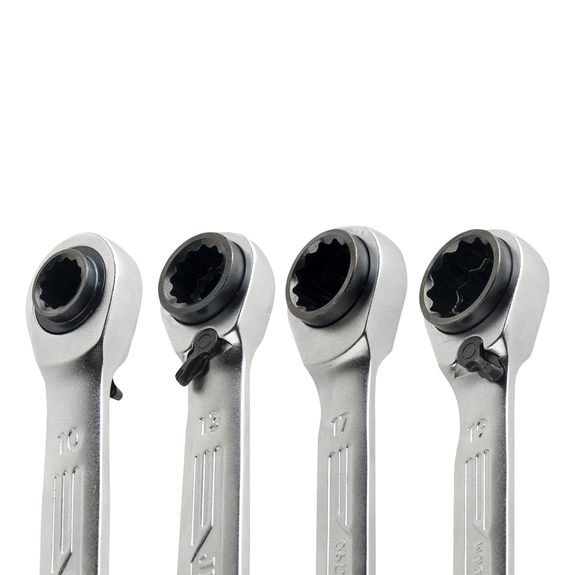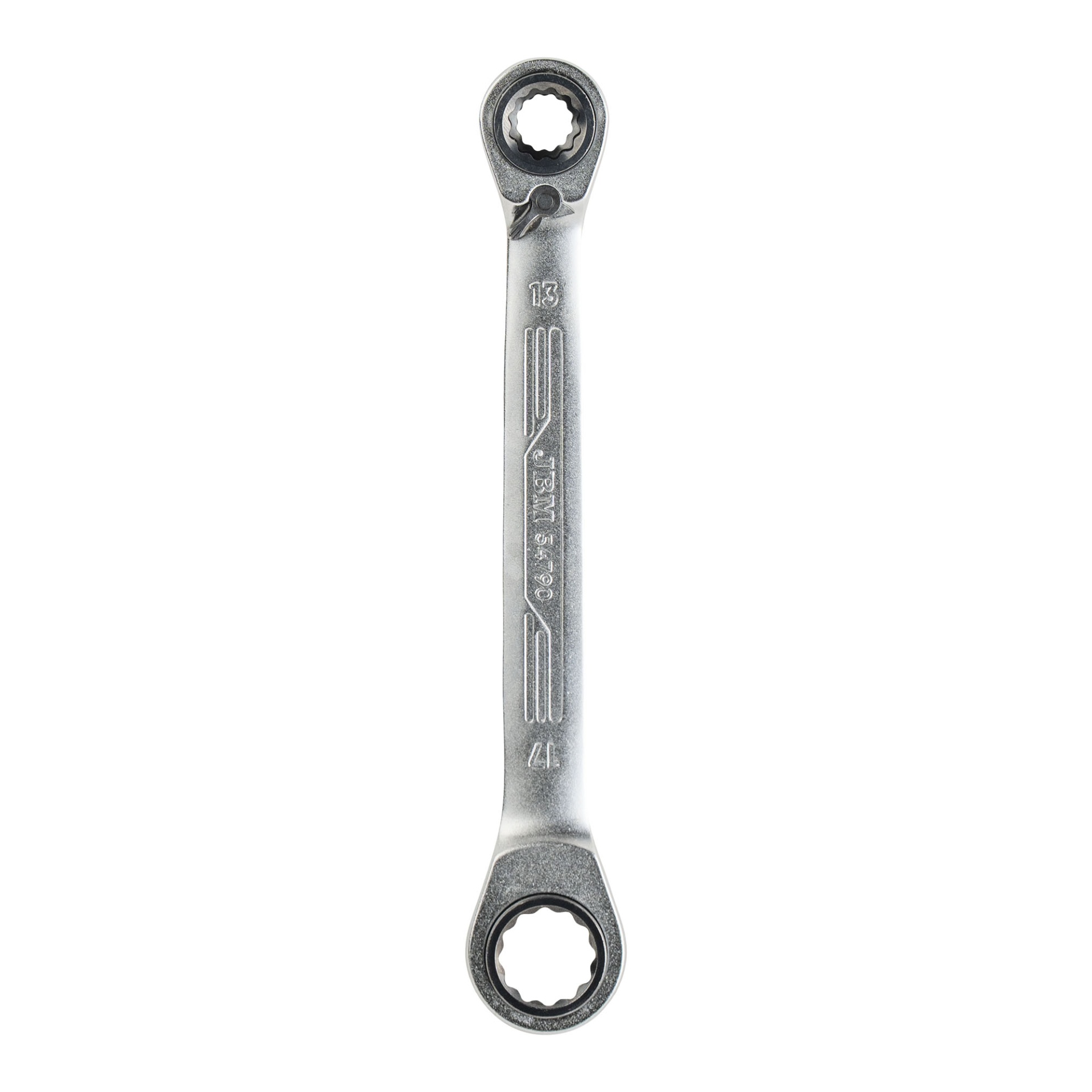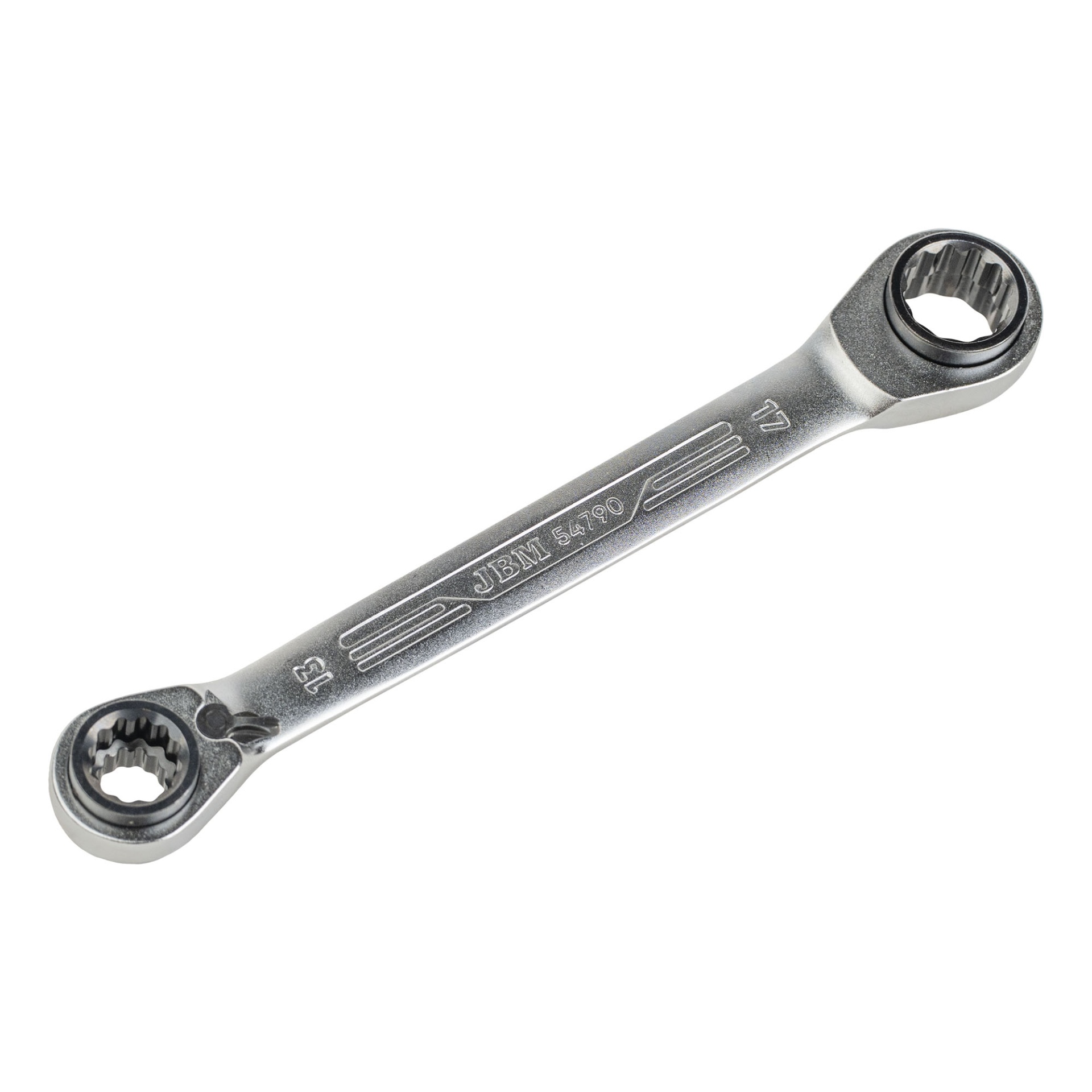 A JBM 54790 é uma chave de catraca (roquete) de alta eficiência, desenhada para oferecer a máxima polivalência no mínimo espaço. Através de um design inteligente de extremidades duplas com medidas escalonadas, esta ferramenta substitui quatro chaves individuais, permitindo ao técnico trabalhar nas medidas mais comuns do setor automóvel (10, 13, 17 e 19 mm) sem precisar de trocar de ferramenta.