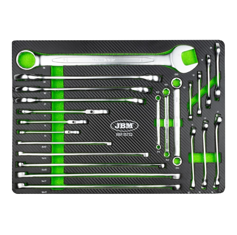 Conjunto de chaves de caixa organizadas em base preta com detalhes verdes