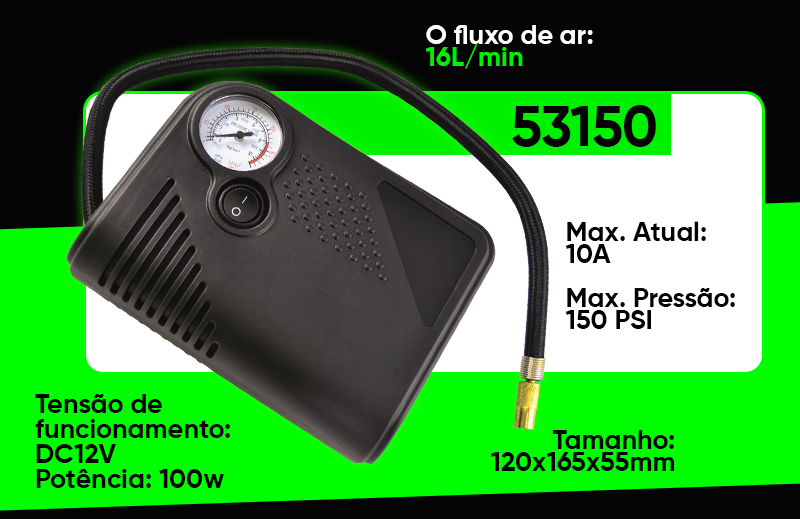Bomba de ar portátil preta com manómetro e mangueira, texto com especificações técnicas