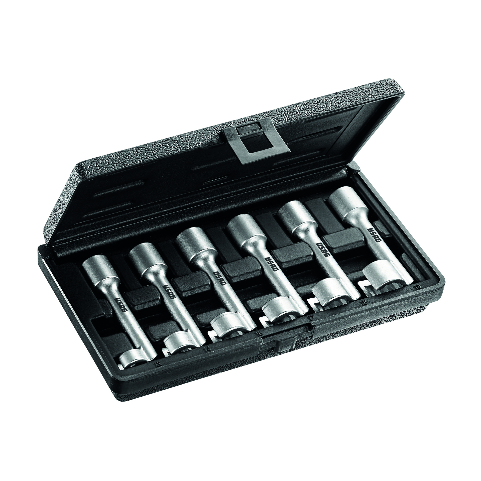 Conjunto de seis soquetes de metal numa caixa preta aberta
