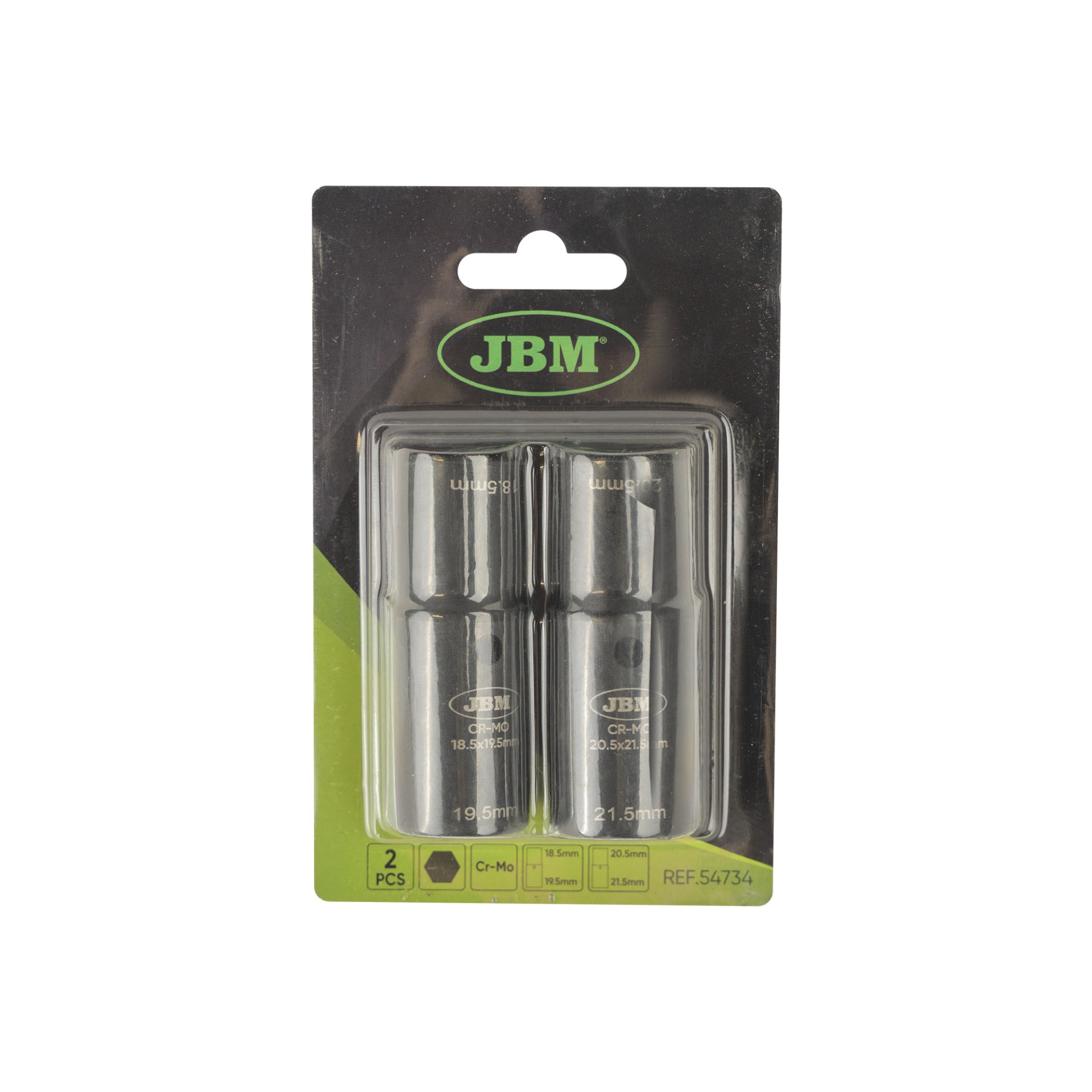 dois soquetes de impacto pretos JBM com medidas 21.5 mm e 19.5 mm sobre fundo branco