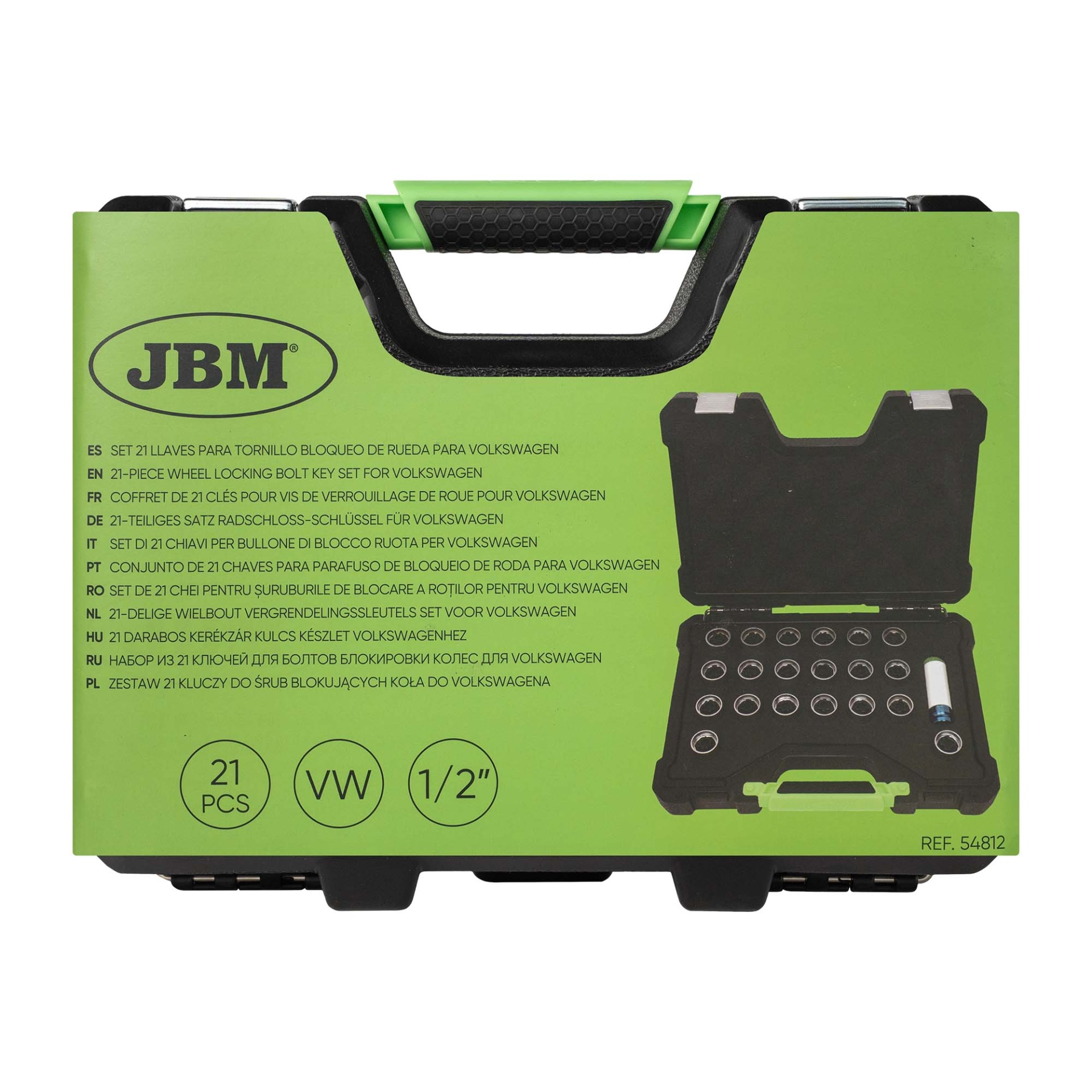 O JBM 54812 é um conjunto de diagnóstico e extração profissional desenhado para os parafusos de bloqueio de roda originais da Volkswagen. Composto por 21 peças, este kit resolve o problema comum de chaves perdidas ou gastas, permitindo ao técnico aceder às rodas de quase toda a frota VW moderna. É uma ferramenta indispensável para manter o fluxo de trabalho em serviços rápidos de pneus, travões e suspensão.