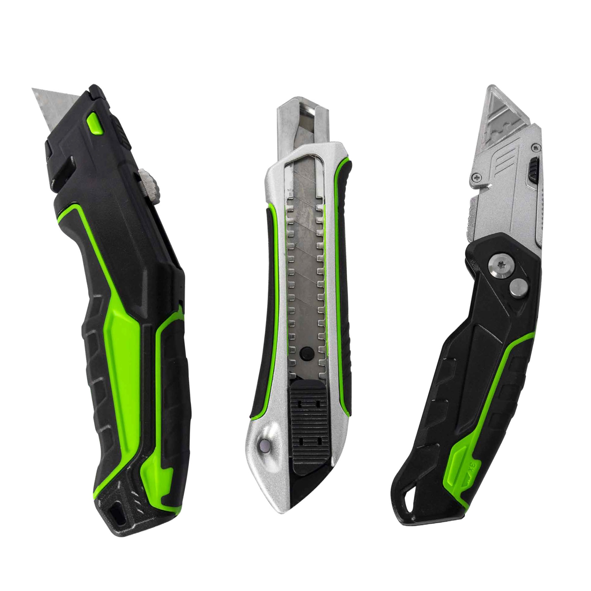 Três estiletes em plástico preto, cinza e verde com lâminas metálicas