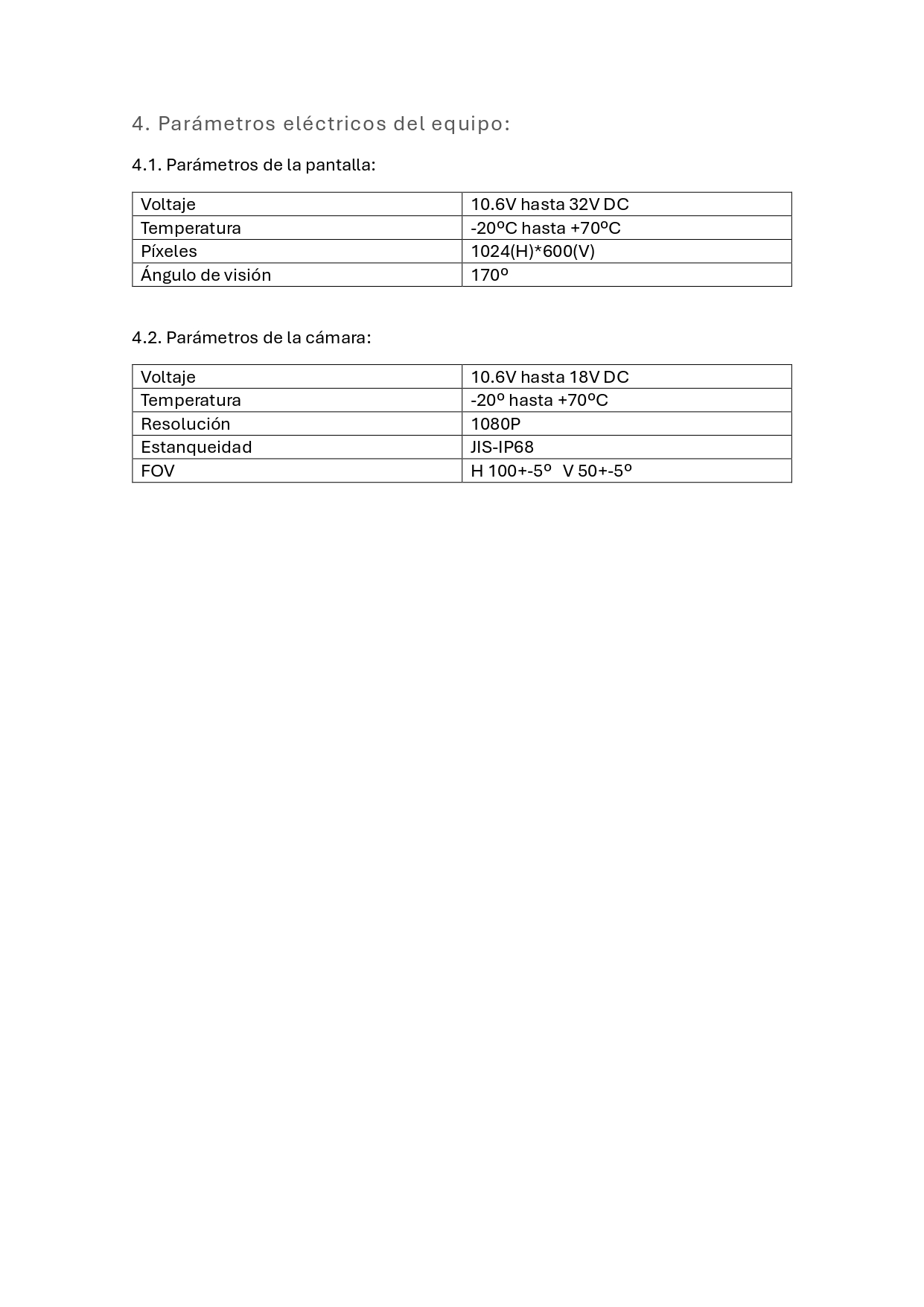 SISTEMA DE MARCHA ATRAS PARA CAMIOES OU CARAVANAS, VEICULOS GRANDES EN GERAL CONSTA DE 1 MONITOR COM ENTRADA PARA 2 CAMARAS PROLONGADOR DE CABO DE 20 METROS COM CONECTOR DE 4 PINOS PODEMOS PASSAR ALIMENTACAO E VIDEO DE DUAS CAMARAS COM UN SO CABO CAMARA DE MARCHA ATRAS ALTA DEFINIÇÃO AHD 1090P 12/24V, FORMATO PAL E RESISTENTE A AGUA IP67 *Monitor de 7 LCD especial para camião com conexões estanques, preparado para trabalhar nas condições mais extremas AHD. * 2 entradas AV *Resolução: 800 x 480, Brilho: 500cd/m2; Contraste 800:1 *Visão normal ou espelho, pode ser alterada por separado em cada câmara *Modo de visualização da tela noturno ou diurno *Autoproteção contra picos de tensão e circuitos *Voltaje de funcionamento: 12 / 24v *Múltiplos idiomas de menu: Inglês , Holandês, Francês, Português, Español, Russo, Alemão * Comando à distância