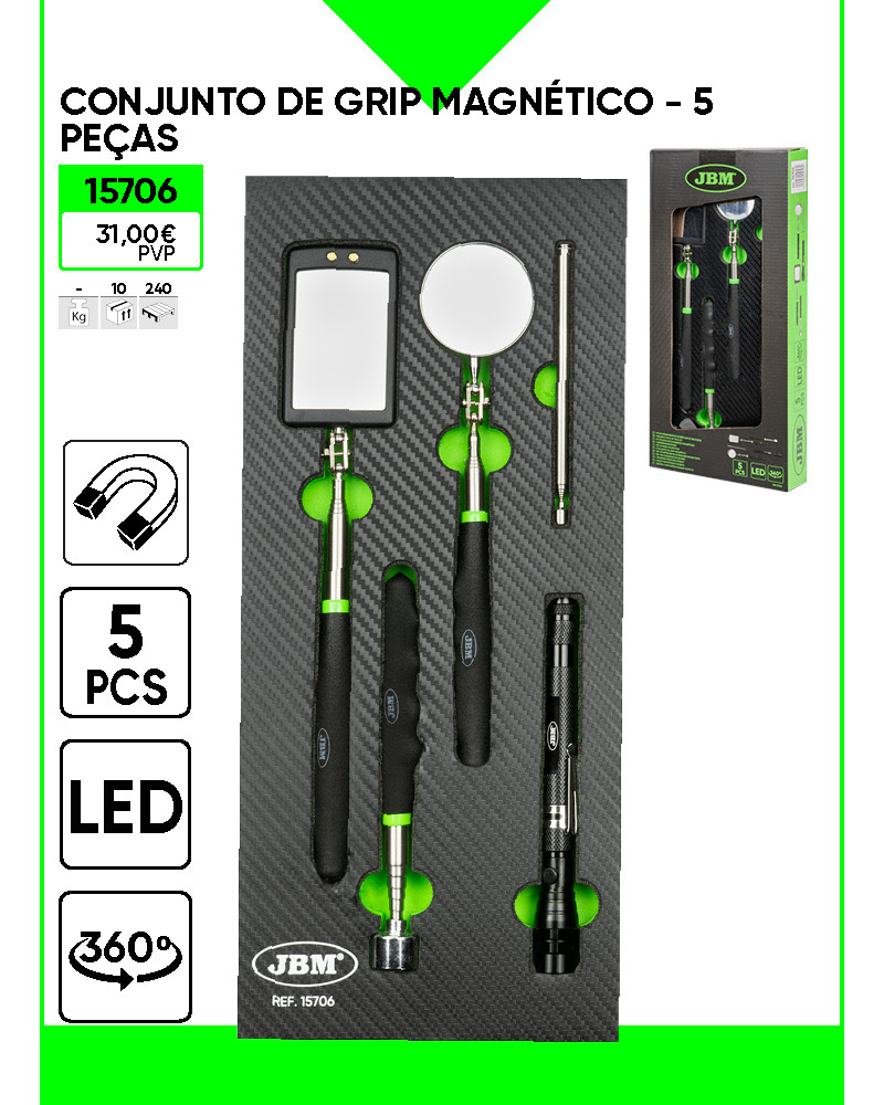 Conjunto magnético de 5 peças JBM com espelhos, barra e lanterna, em embalagem verde.