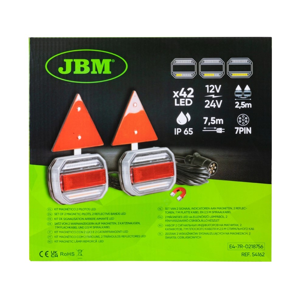Tensão: 12-24 V Número de LEDs: 42 Funções: - Posição - Placa - Luz de freio - Sinal de direção Comprimento do cabo entre as luzes LED: 2,5m Comprimento do cabo de conexão: 7,5m Grau de proteção: IP65 Número de pinos do conector: 7 Medidas de luz LED: 118x93x58mm Peso: 1,5kg