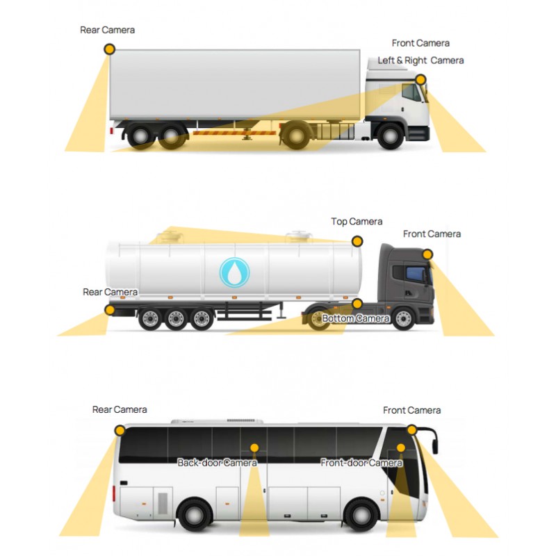 Permite gravação continua, monitorização de ângulos mortos, câmaras laterais inteligentes, visão traseira com imagem individual ou de duas imagens em simultâneo no ecrã. 12 / 24V.