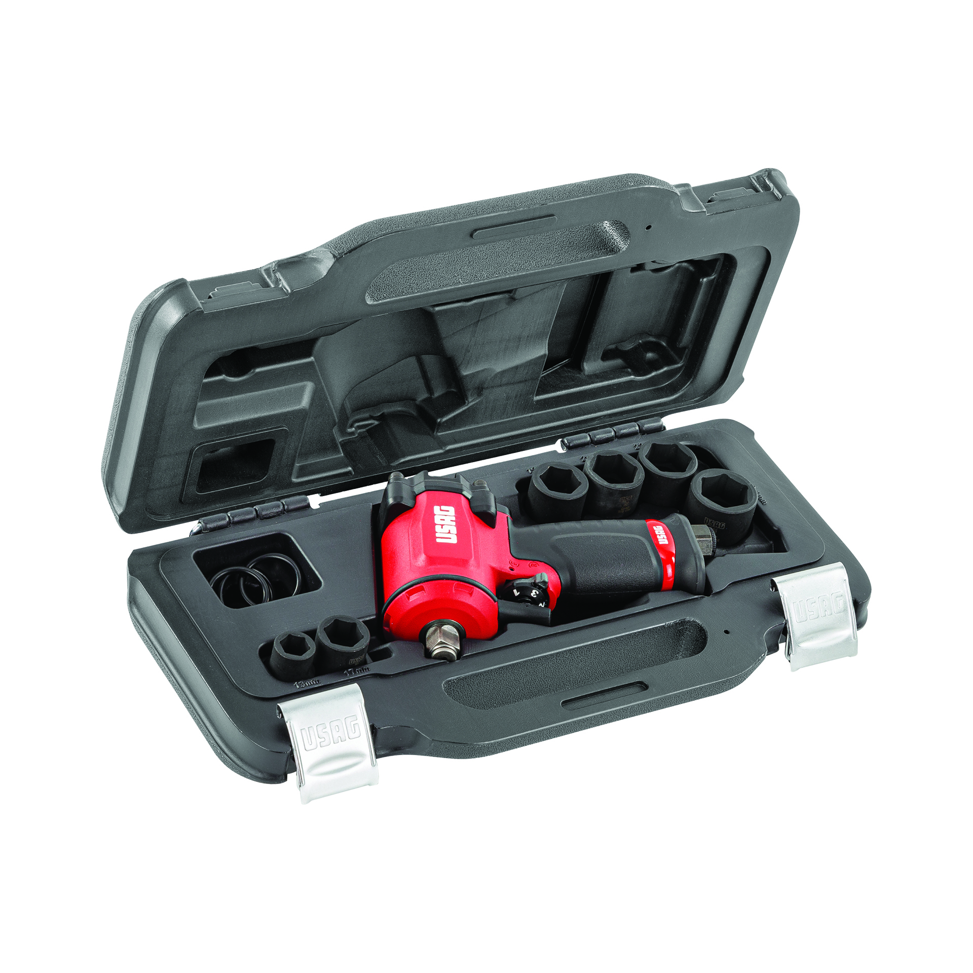 Conjunto de ferramenta com chave de impacto pneumática vermelha e bocas de encaixe em estojo preto