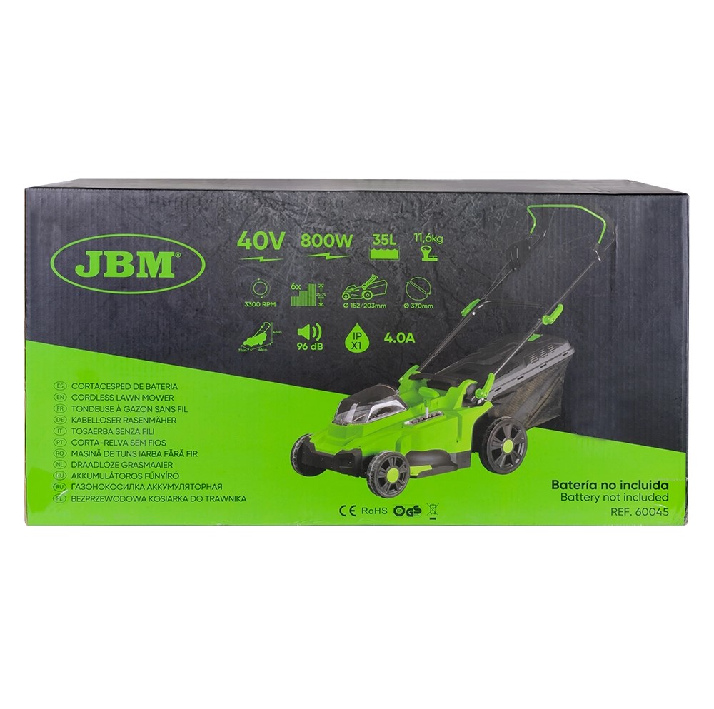 Tensão da bateria: 40V (2x20V) DC Capacidade da bateria: 4,0 Ah(x2) Potência: 800W Velocidade rotação: 3300rpm Diâmetro de corte: 37cm Altura de corte: 6 (25-75mm) Tipo de lâmina cortante: Lâminas com pontas curvas Tamanho da lâmina cortante: 370x45mm Capacidade do saco de recolha: 35 l Tipo de proteção: IPX1 (Proteção contra gotas de água) Categoria de proteção: III Motor sem escovas: Sim Tipo de propulsão do corta-relva: Autopropulsor Nível de pressão acústica LpA: 71,3dB Nível de potência acústica LwA: 96dB Tipo de corta-relva: Rotativo Diâmetro da roda da frente: 15,24cm Diâmetro da roda de trás: 20,32cm Material da caixa: Polipropileno Peso do corta-relva: 11,6 kg Peso com baterias: 12,4 kg Dimensões (comprimento x largura x altura): 68x42x32cm