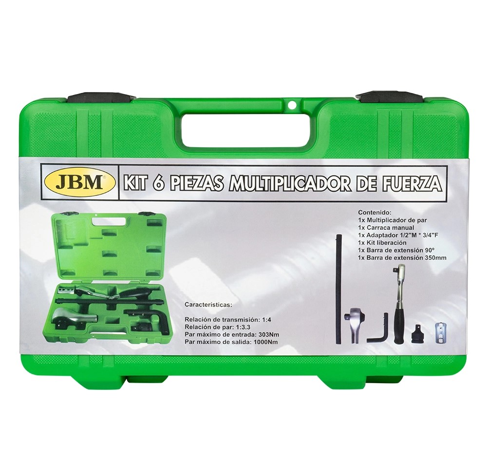Estojo verde com etiqueta branca e texto KIT 6 PIEZAS MULTIPLICADOR DE FUERZA
