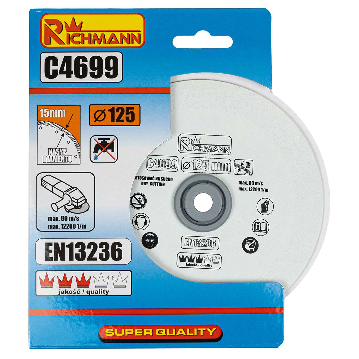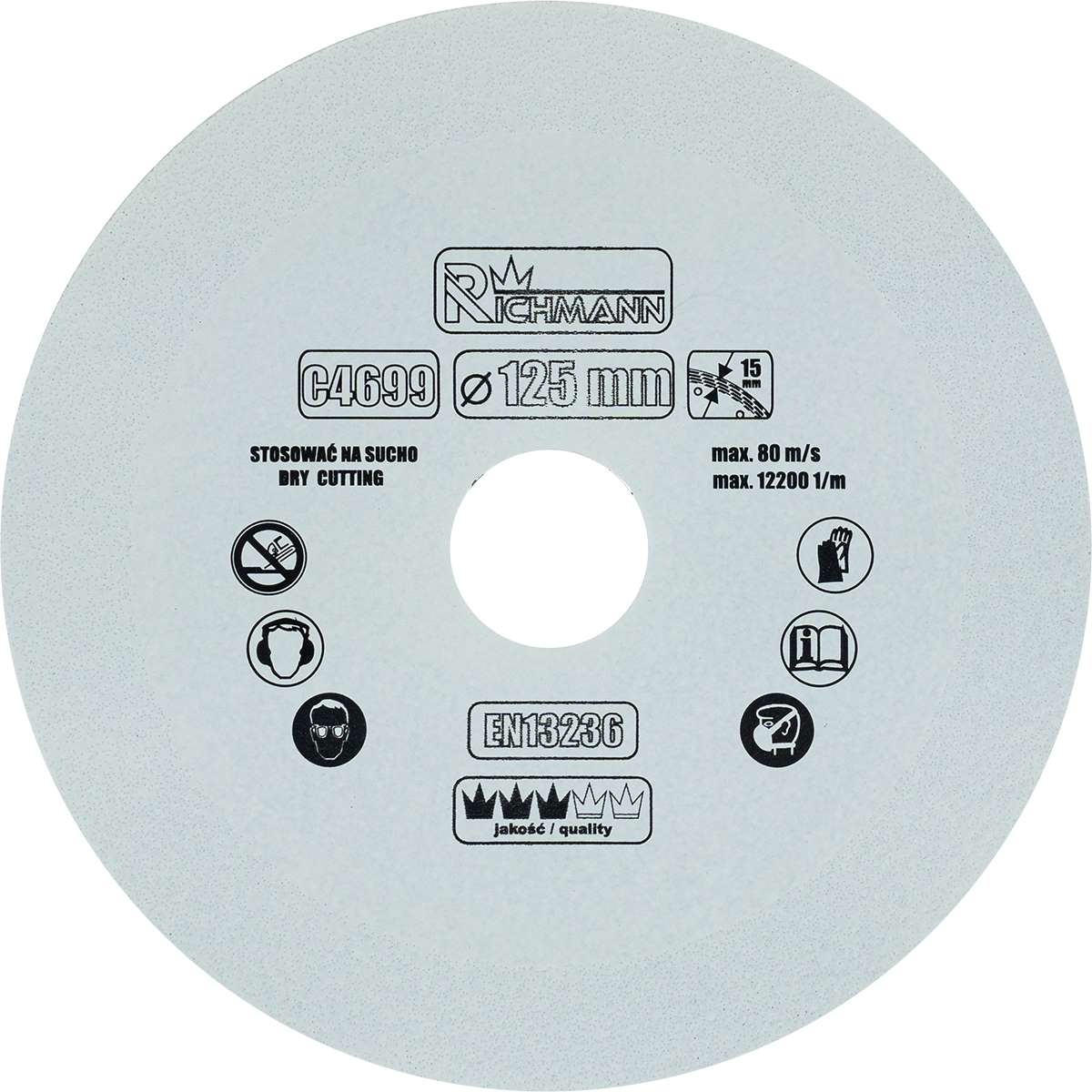 O diâmetro do disco é de 125 mm. Superfície de diamante de 15 mm.