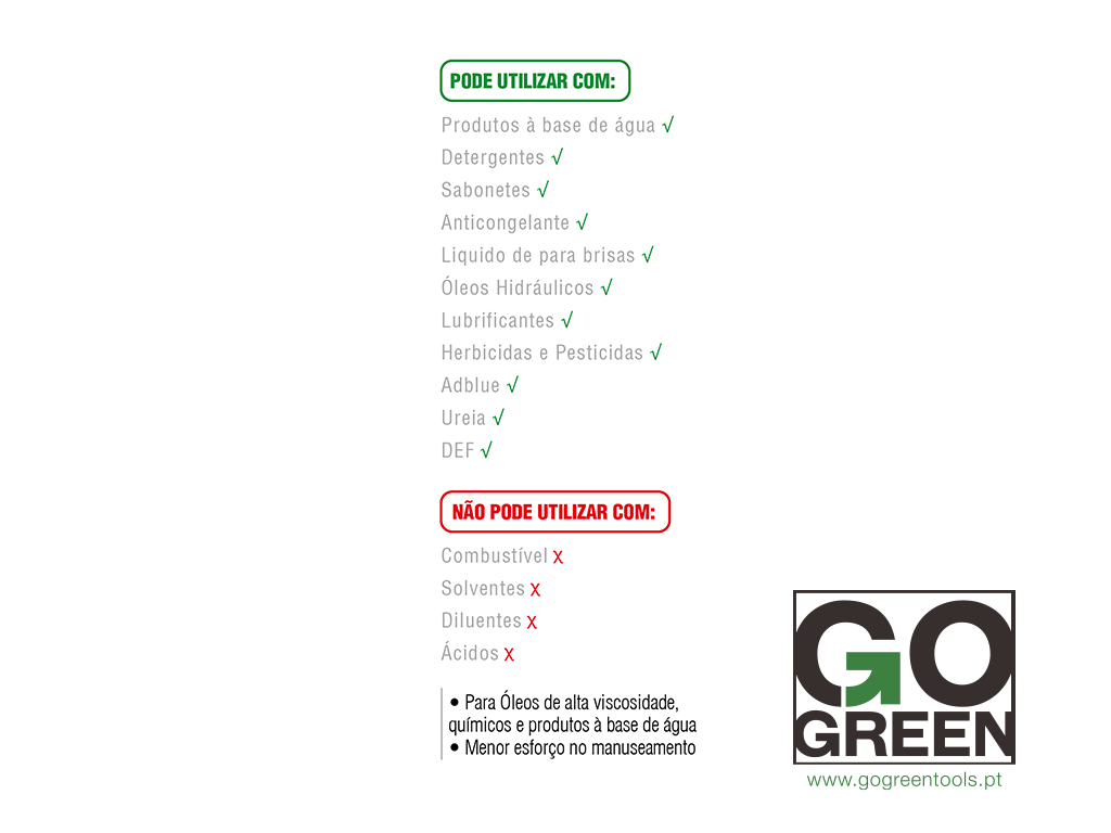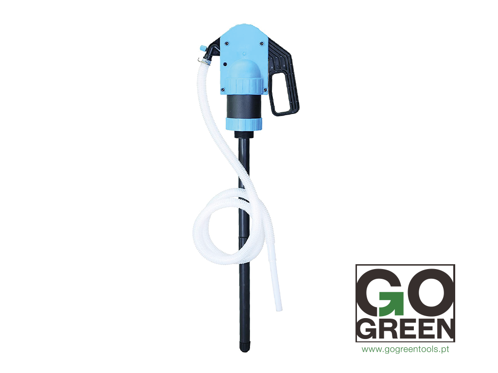Bomba manual de transferência de líquidos azul e preta com tubo flexível branco e logo GO GREEN.
