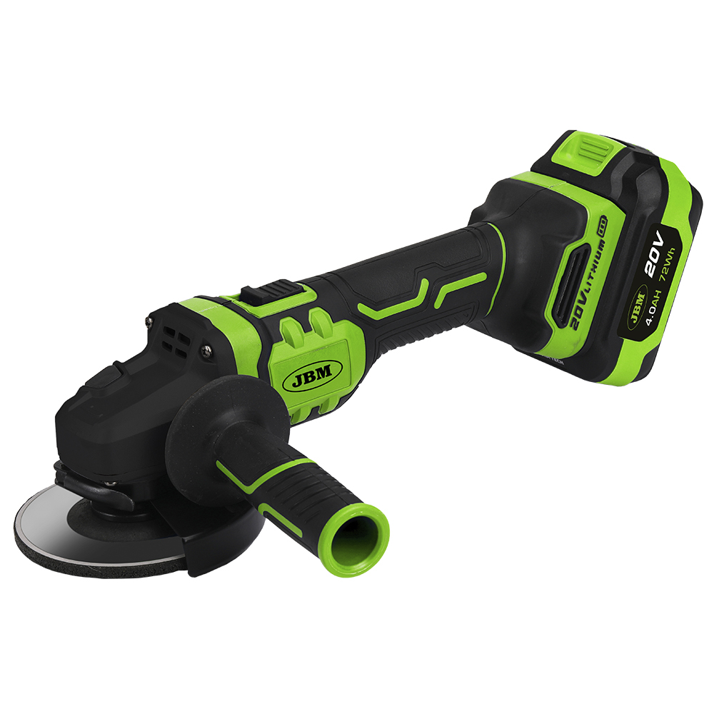 Esmerilhadora angular preto e verde com pega lateral e logótipo JBM