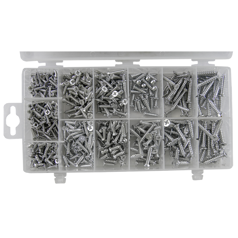 Caixa plástica transparente com parafusos prateados organizados em compartimentos