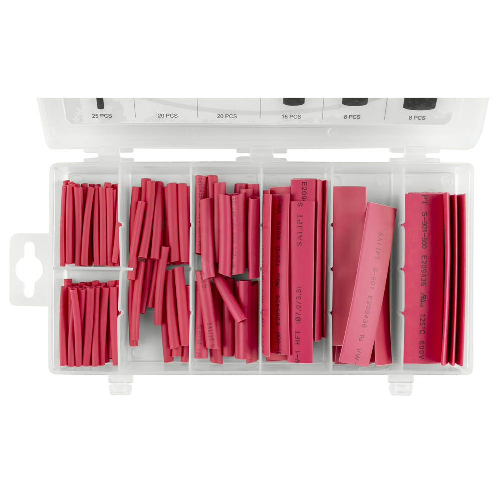 Conjunto de tubos termorretráteis vermelhos em caixa plástica com divisórias