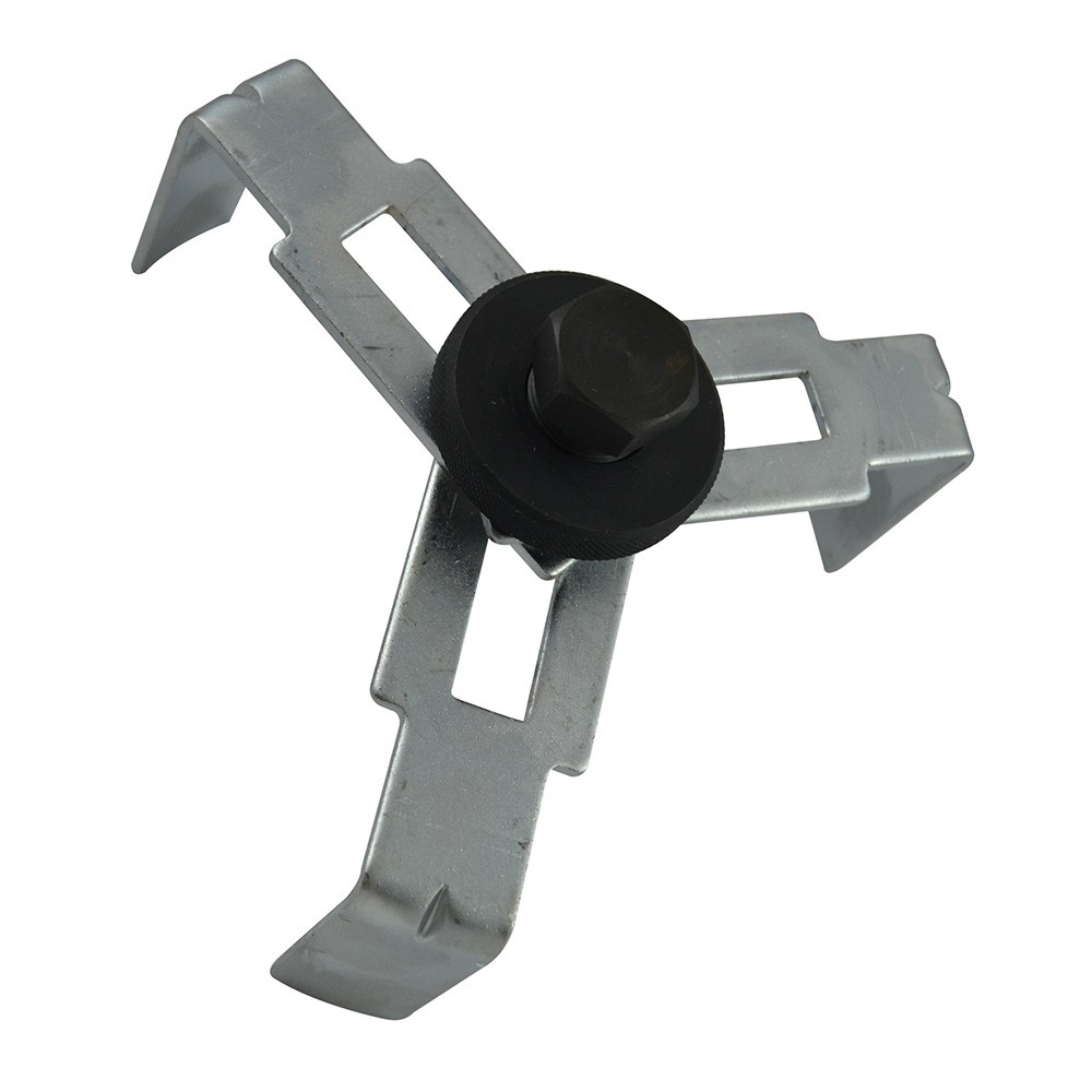 Ferramenta metálica com três braços e peça circular preta ao centro