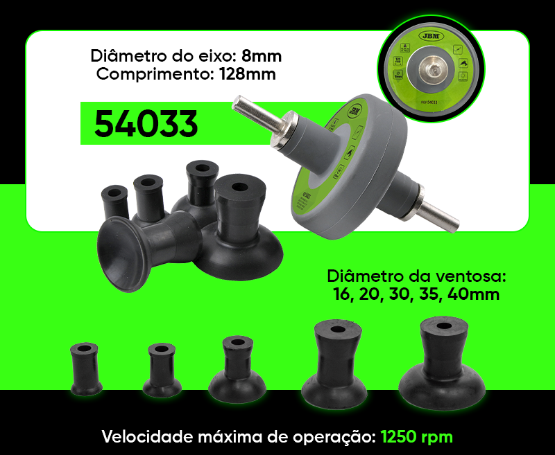 Conjunto de ventosas para máquina com diferentes tamanhos e especificações técnicas em fundo preto e verde.