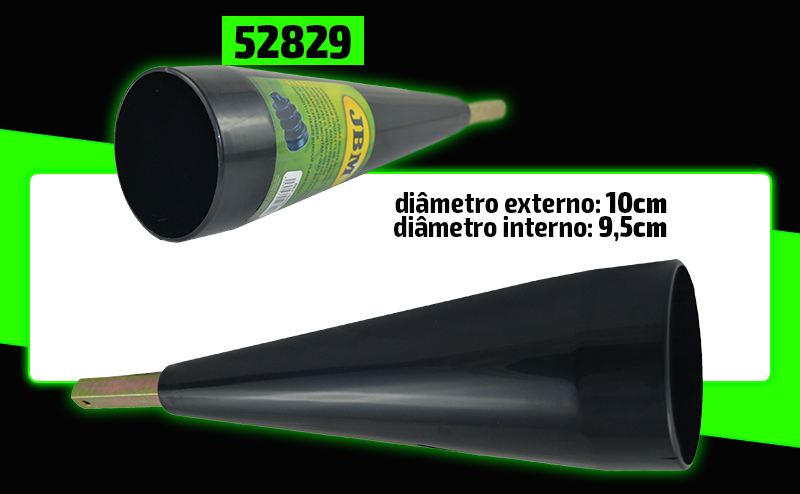 Funil preto de plástico com haste metálica, um com etiqueta verde e imagens de uvas