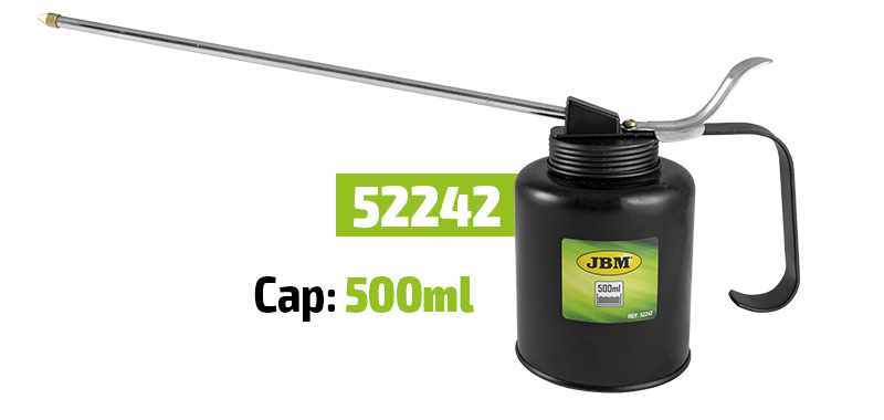 Frasco lubrificante preto com bico metálico e etiqueta verde