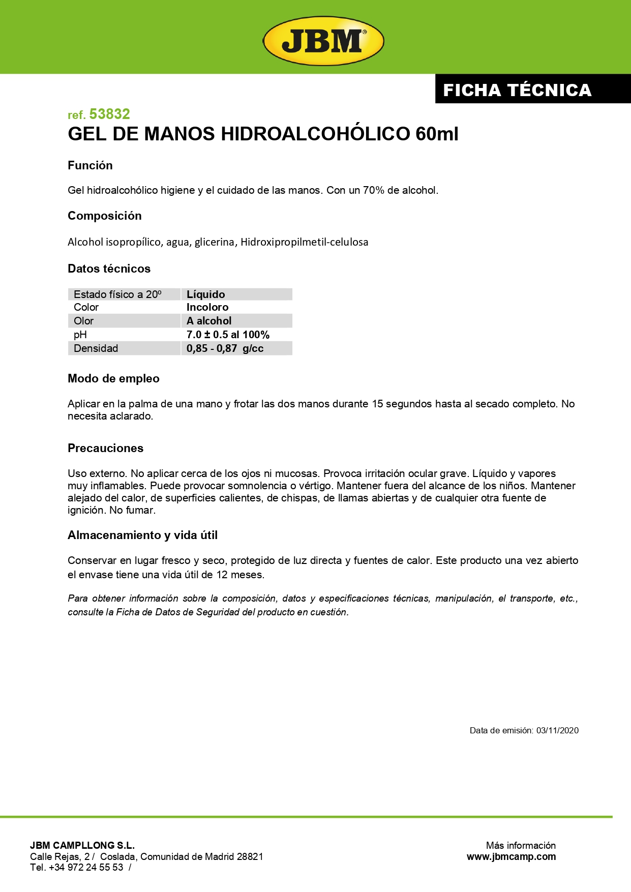 Frasco de gel hidroalcoólico para mãos JBM com rótulo verde e amarelo