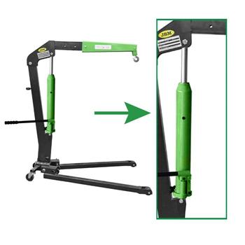 Guindaste hidráulico metálico preto e verde com gancho e rodas